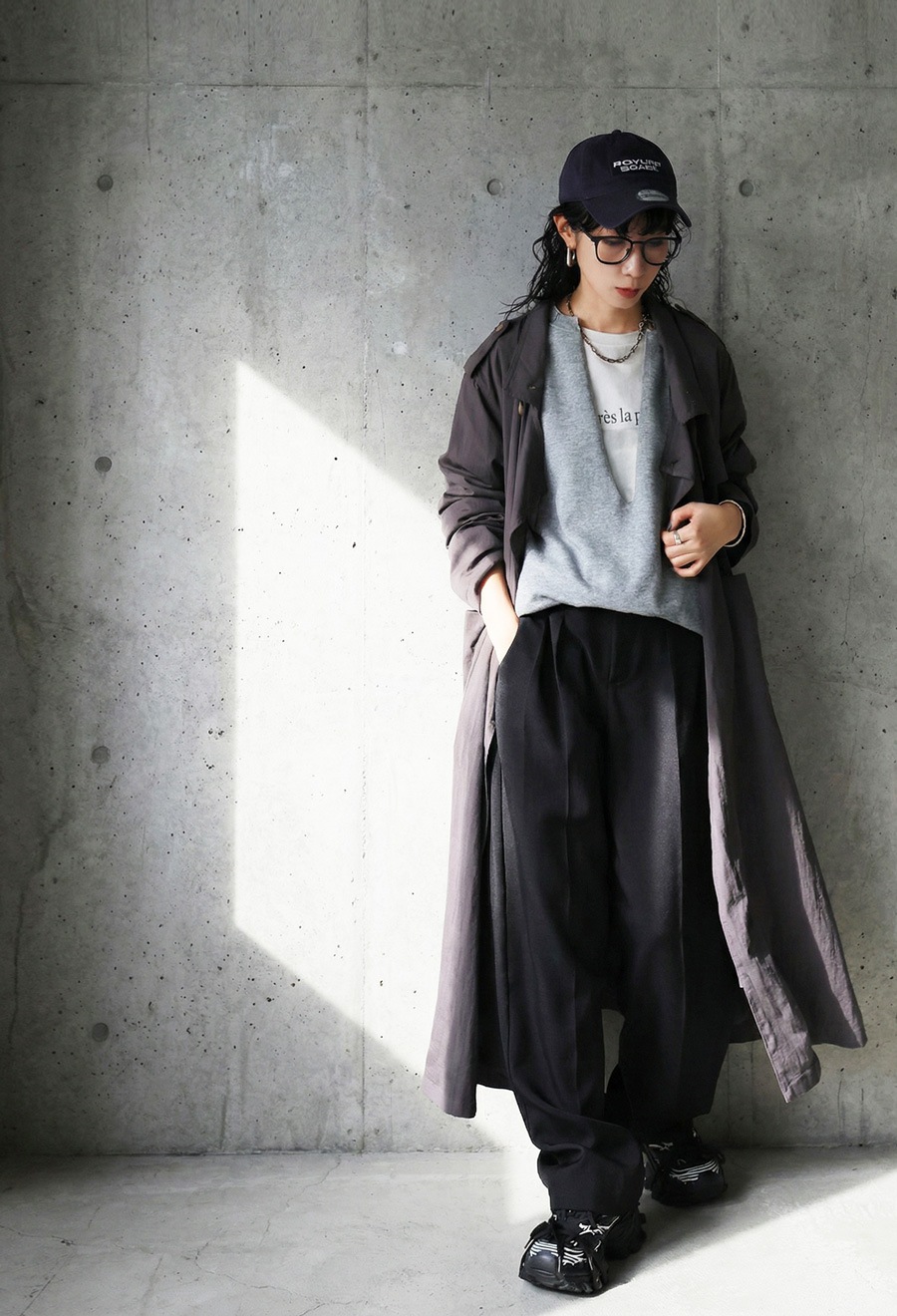 無地で合わせやすく、形状はサイドスリット入りで動きやすさと抜け感を両立。