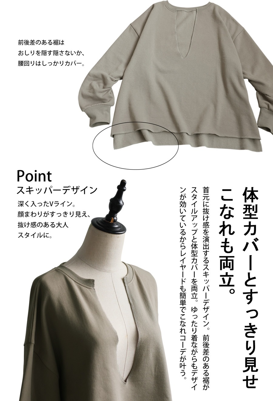 丈感はヒップラインを自然に隠す安心感のある長さで、前後差のある裾がスタイルアップに貢献します。