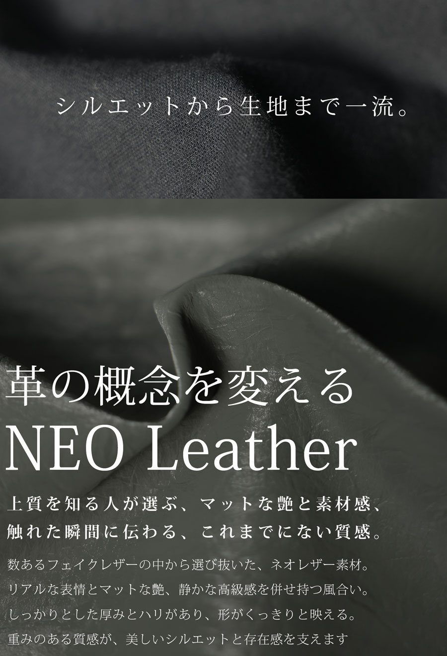 マットで高級感のある風合いを持つネオレザー素材は、従来のフェイクレザーとは一線を画す新質感。