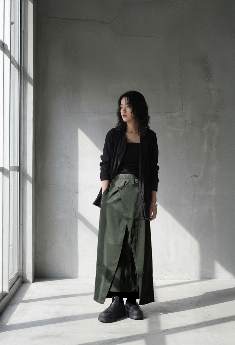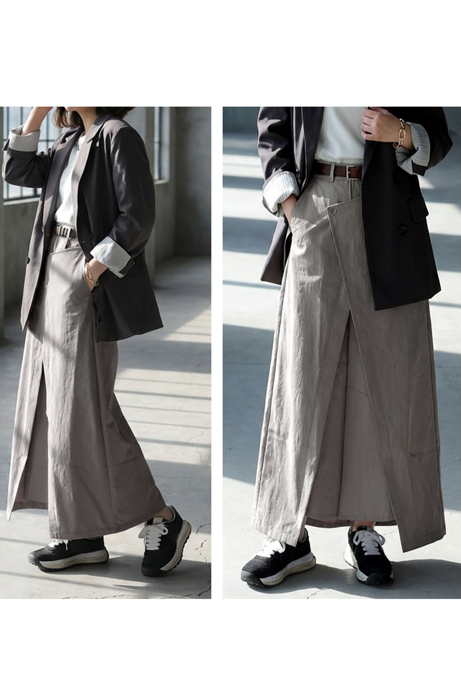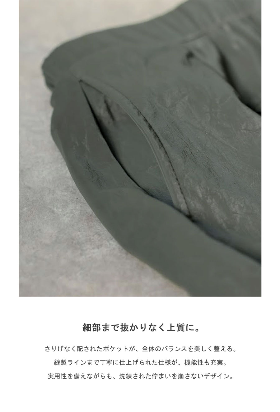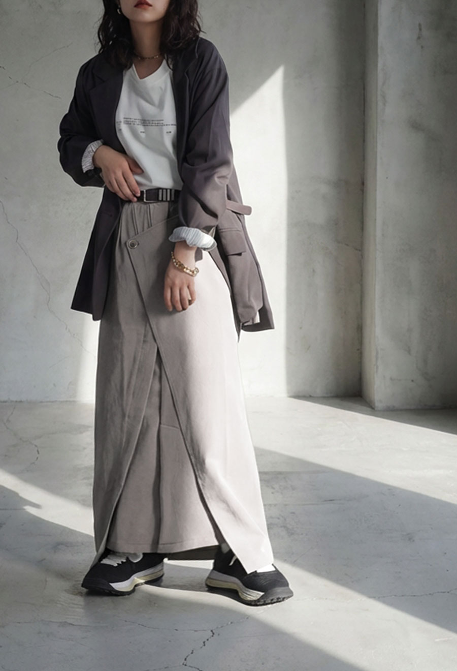 丈感は足首が見えるほどのロング丈で、縦ラインを強調しスタイルアップ効果も。