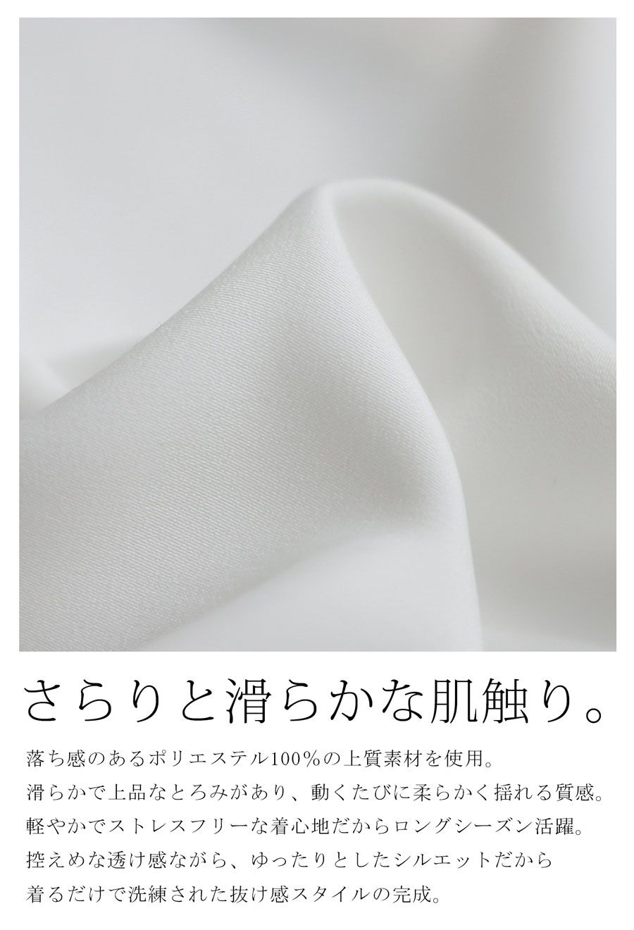 さらりとしたポリエステル100%素材で、軽やかな落ち感と滑らかな肌触りが魅力です。