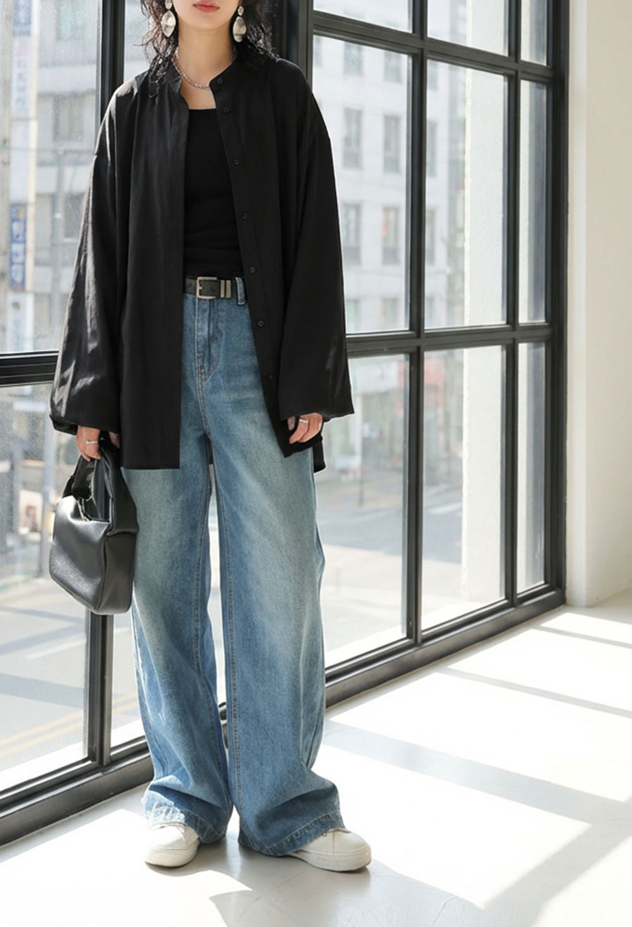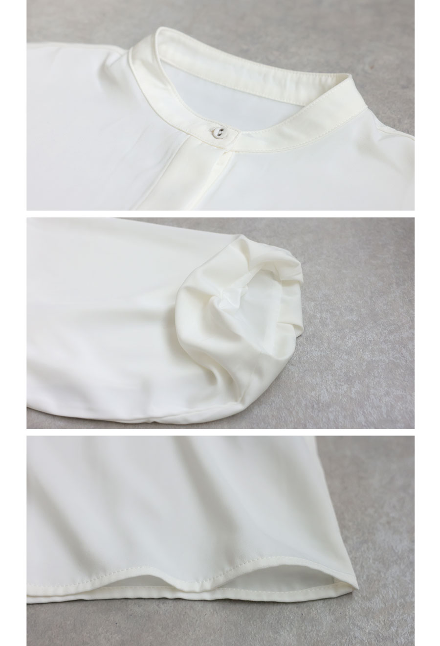 ネックラインはすっきりとしたバンドカラー(スタンドネック)で、顔まわりに抜け感を演出します。