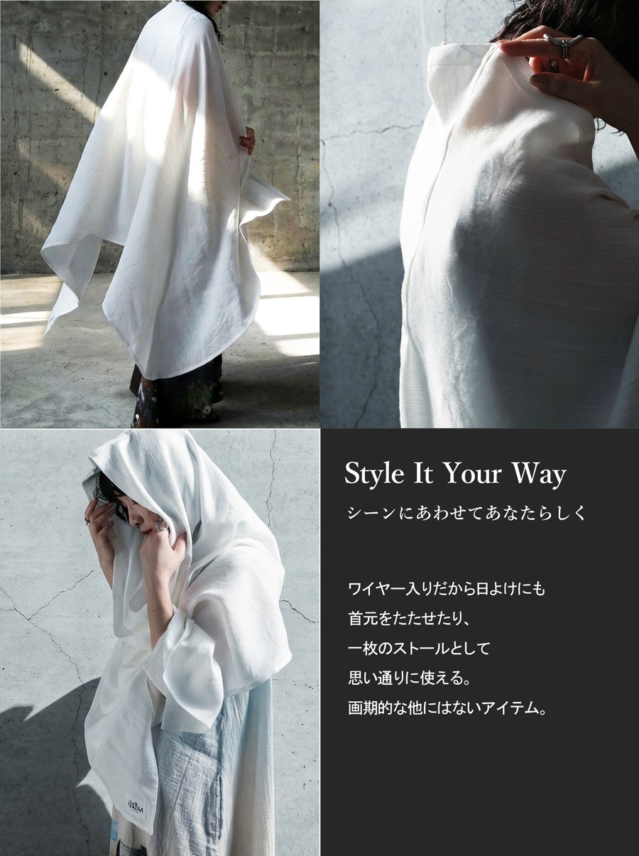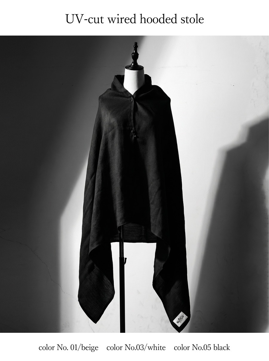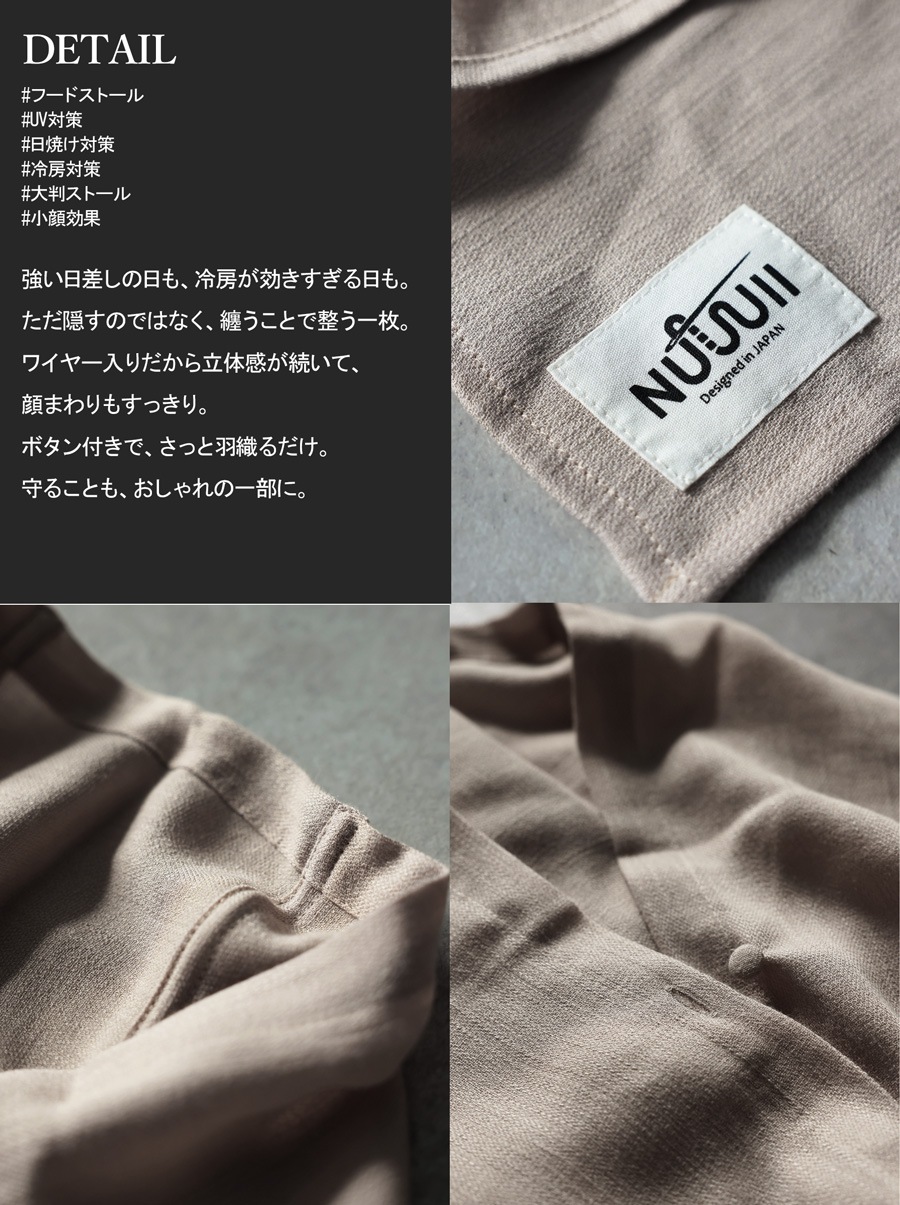 日差しから守りながら装いに個性を添える、フード付きのUVカットストールです。