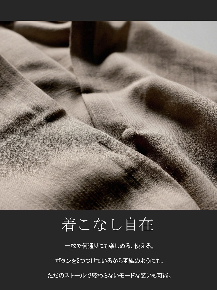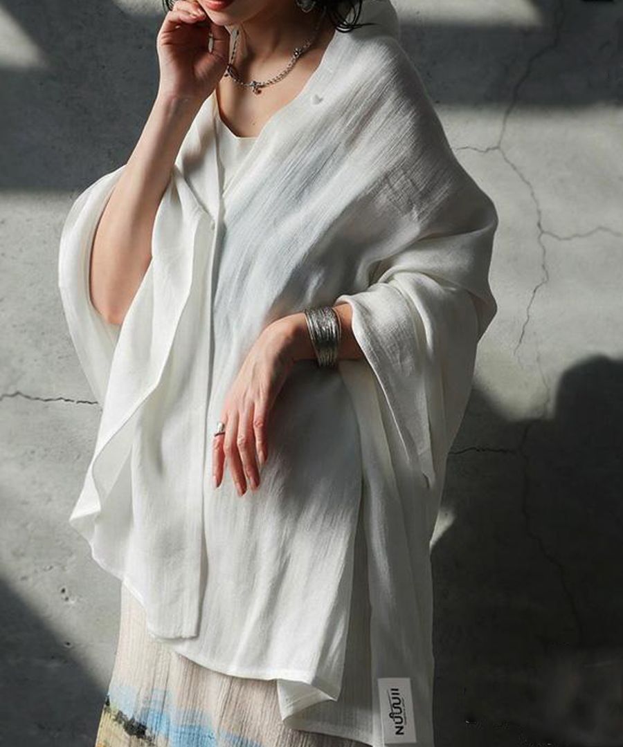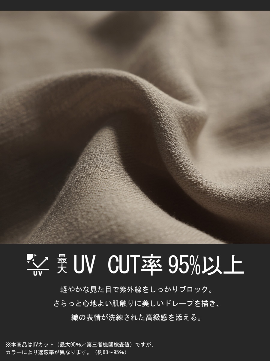 長めの丈感が肩から腕先までしっかり覆い、日焼け対策や冷房対策にも活躍します。