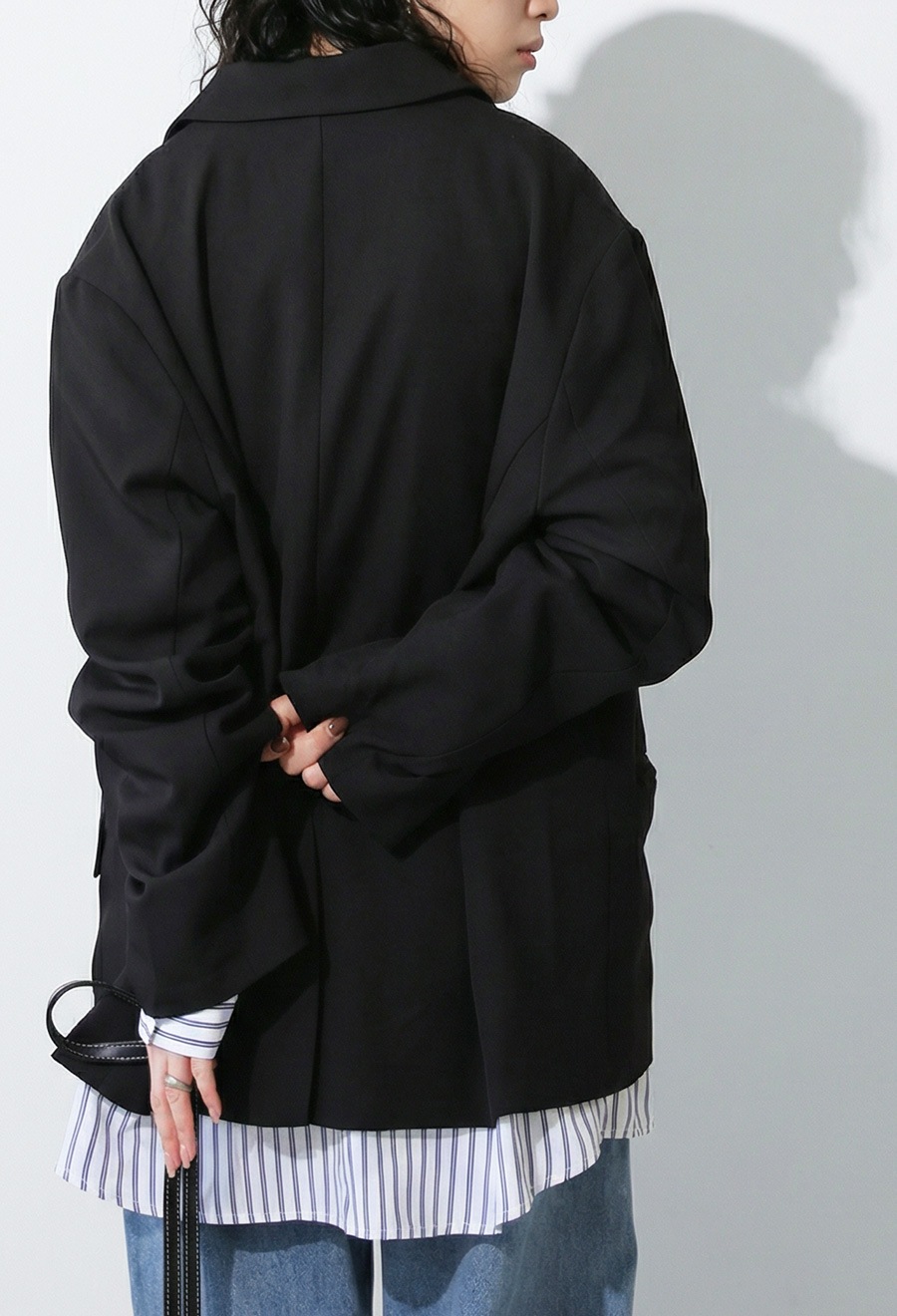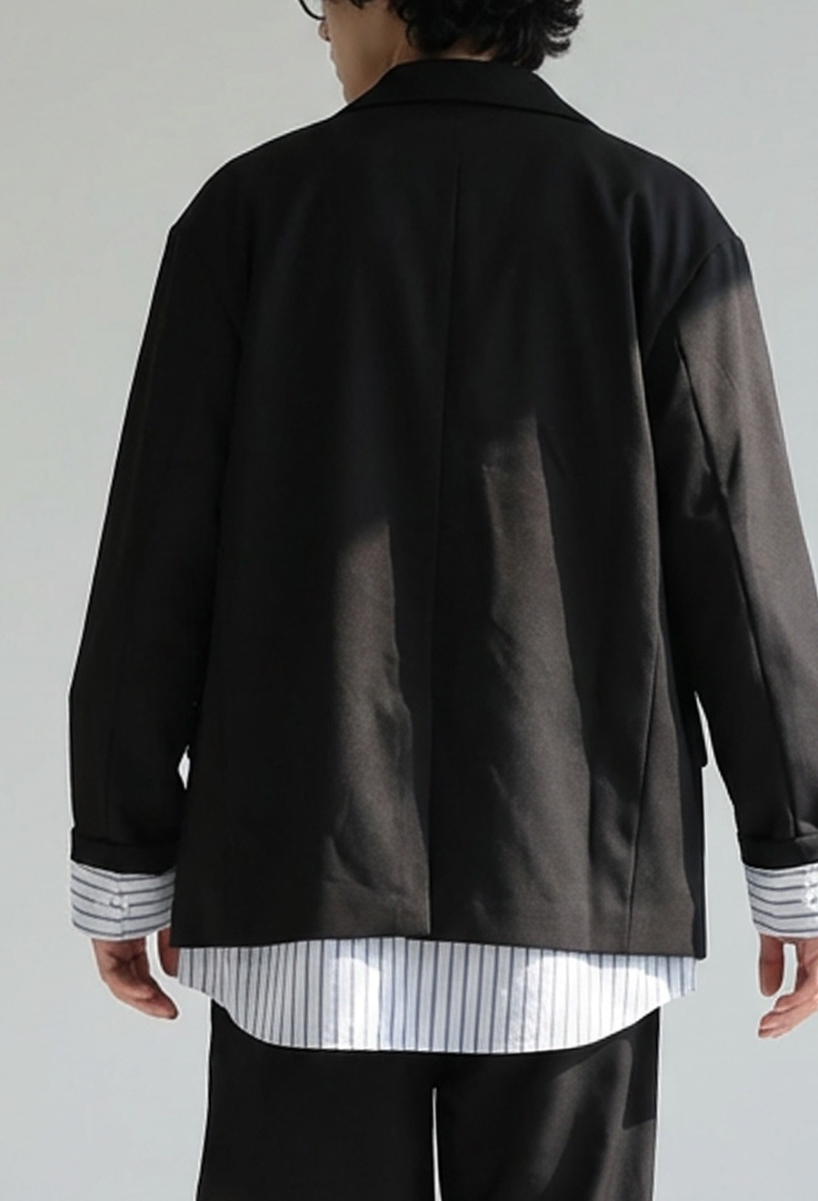 テーラードジャケットらしい端正な仕立てに、ストライプ柄のシャツを重ねたような切り替えデザインを採用。