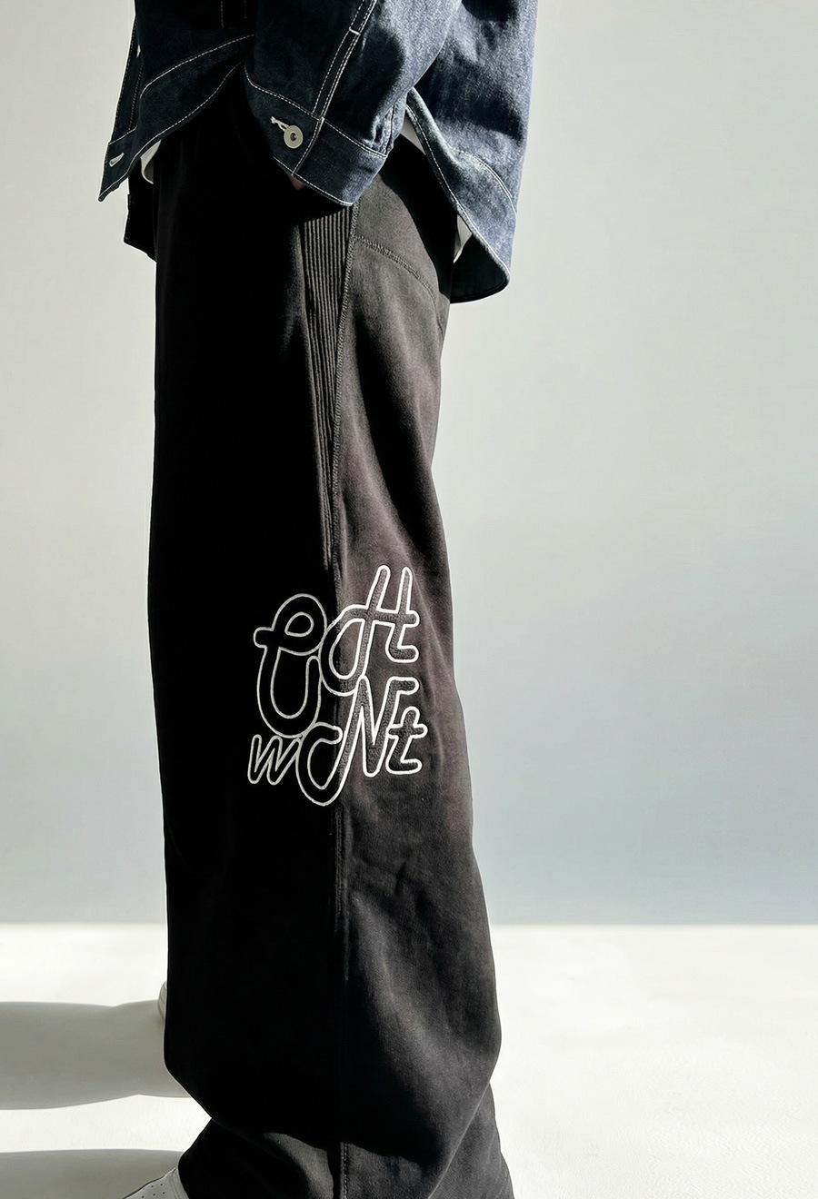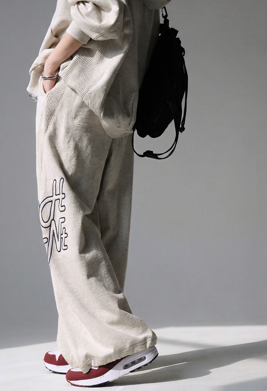 左足前後にかかるように配置されたロゴ刺繍が、スポーティーでストリートな雰囲気を演出。