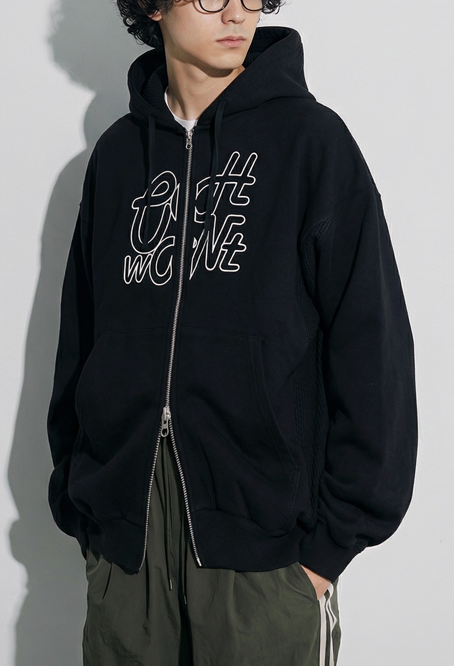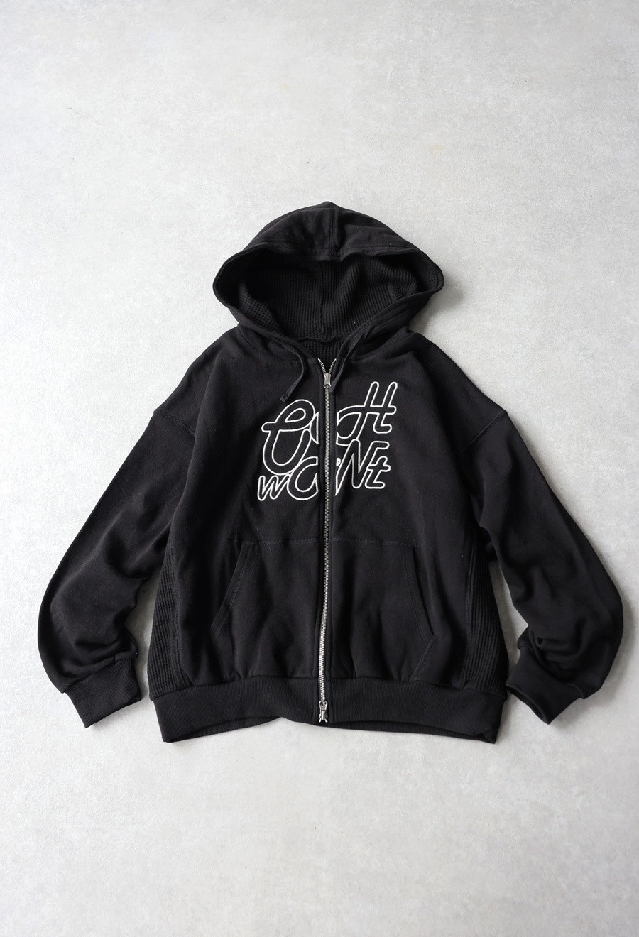 裏毛とワッフル生地を組み合わせたダブルフェイス仕様が魅力のジップアップパーカー(フーディー)です。