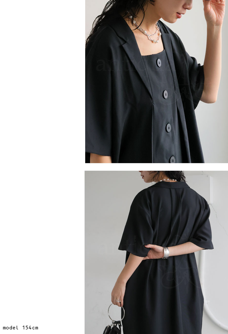 テーラードデザインのネックラインが上品かつきれいめな印象を与え、普段着にはもちろん、モードな雰囲気を活かしたライトフォーマルやパーティー、二次会スタイルにも対応します。