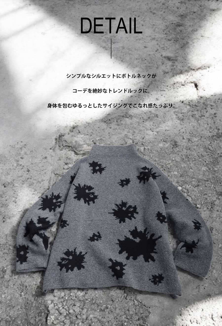 首元を包むボトルネック(ハイネック)仕様で、季節感のある装いを演出します。