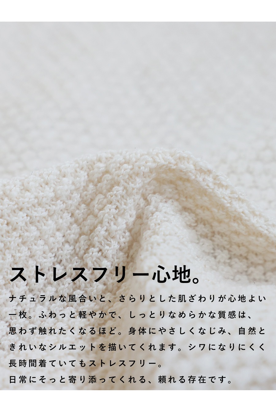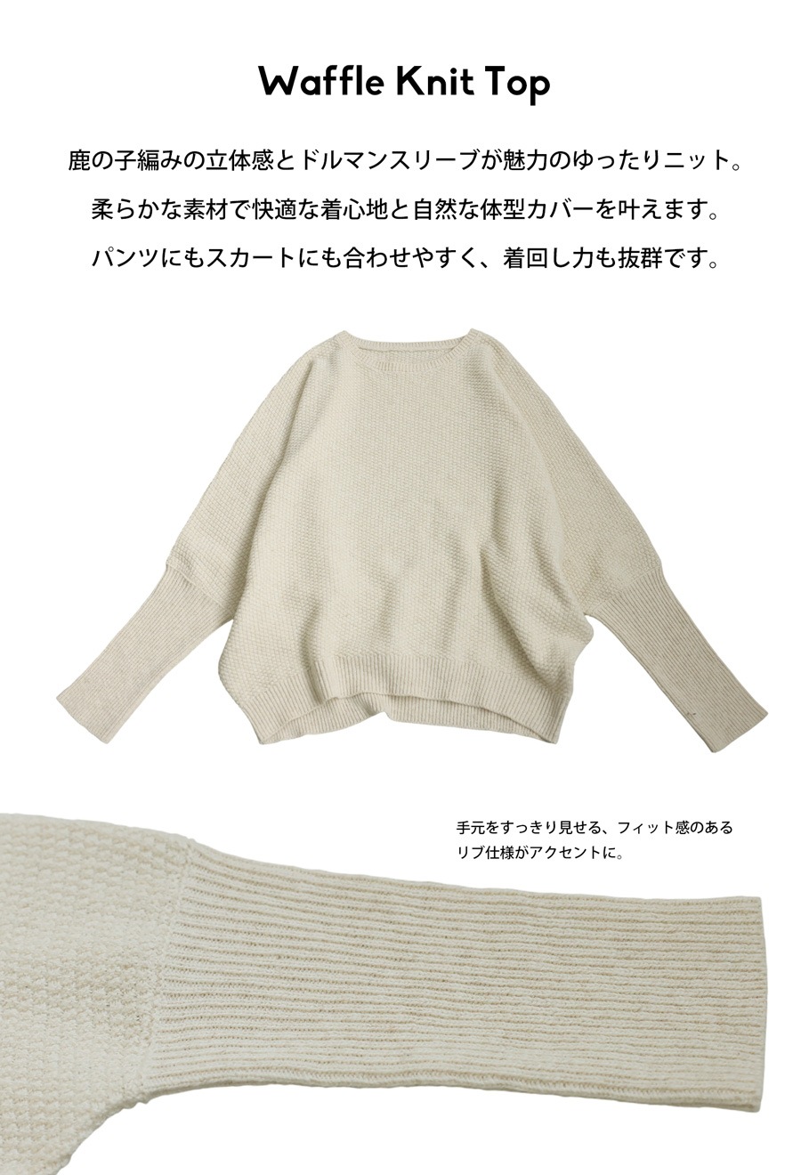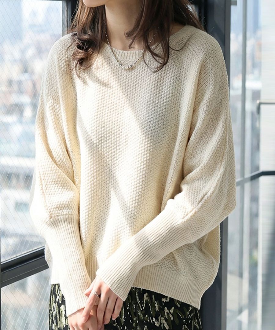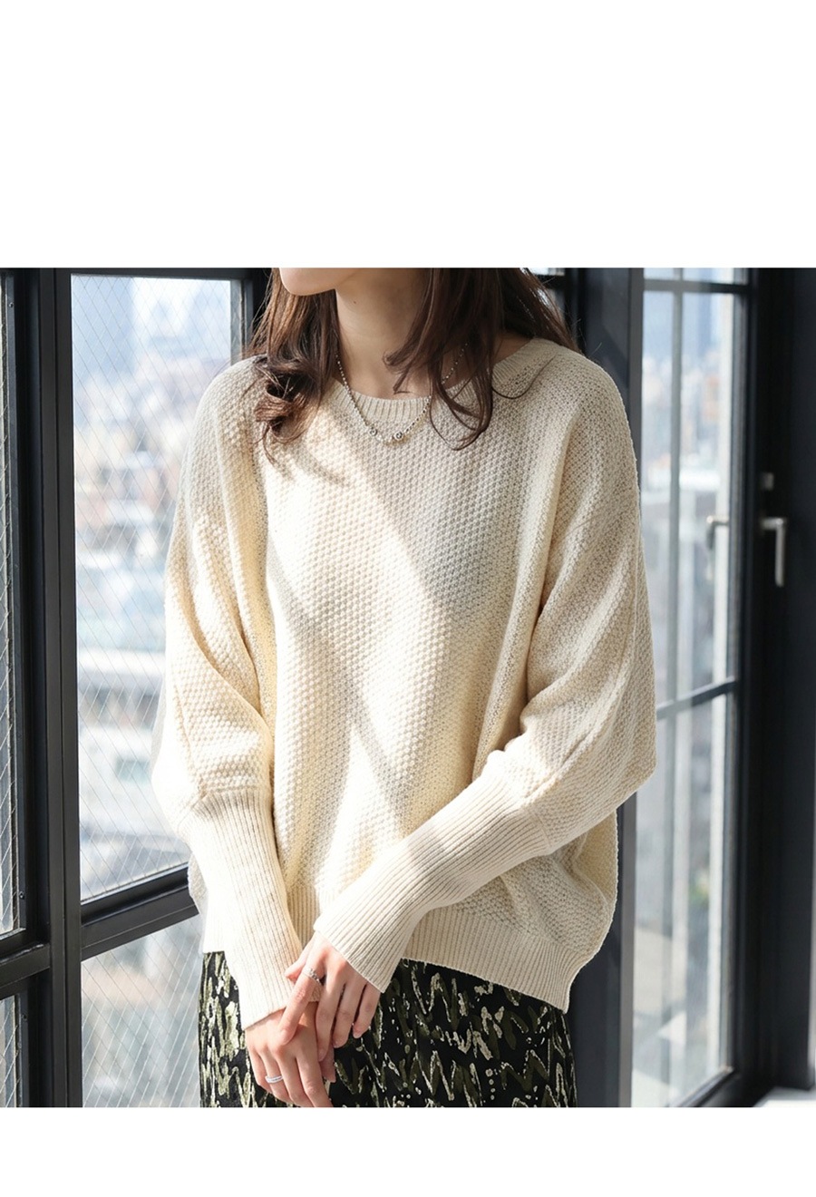 立体感ある鹿の子編みがやさしい印象を与えるニットトップス(セーター)です。