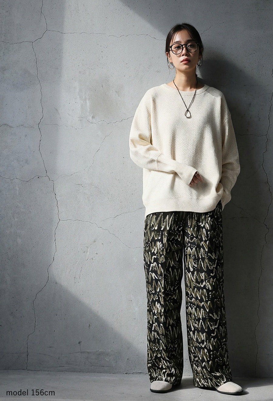 全体のシルエットは体型を拾いにくいゆるめのラインで、リラックス感のある着心地を実現。