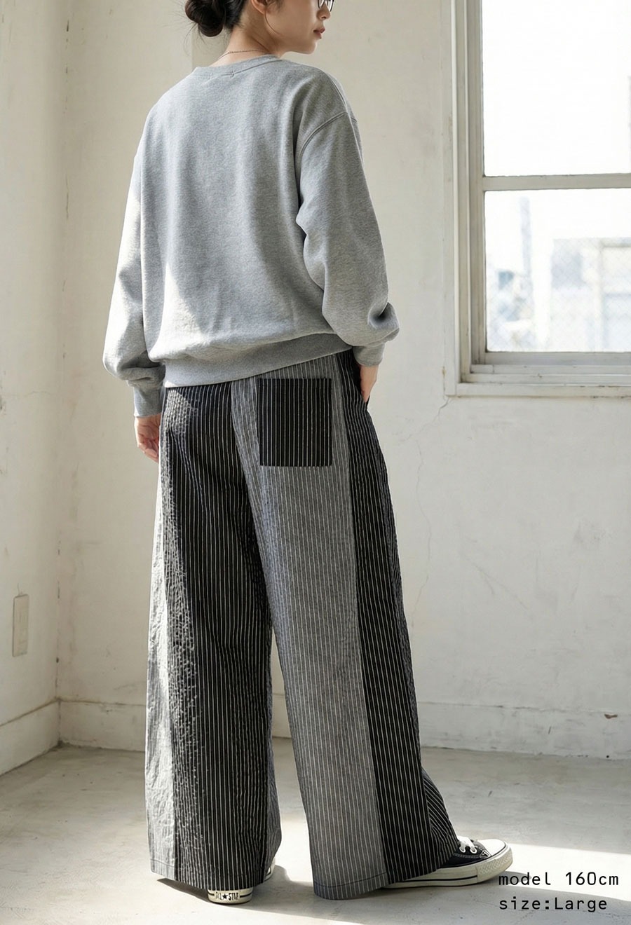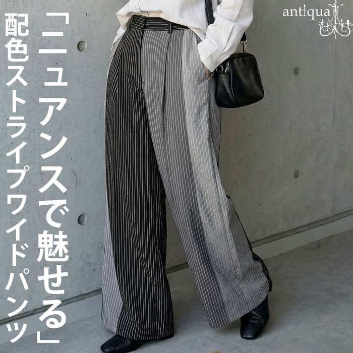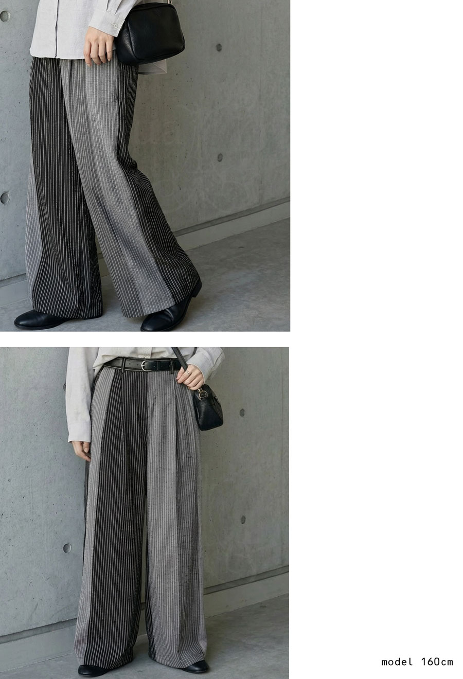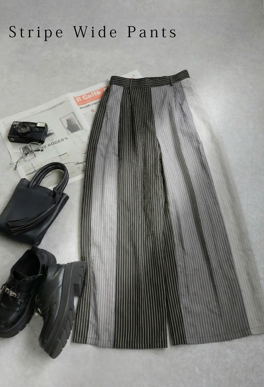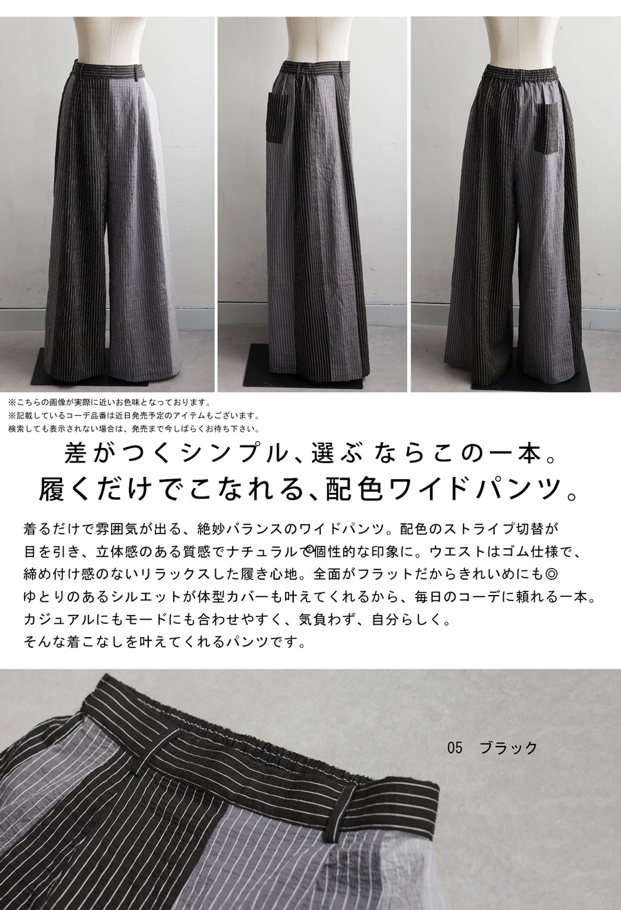 存在感あるストライプ柄を配色で切り替えた、ニュアンス感漂うワイドパンツです。