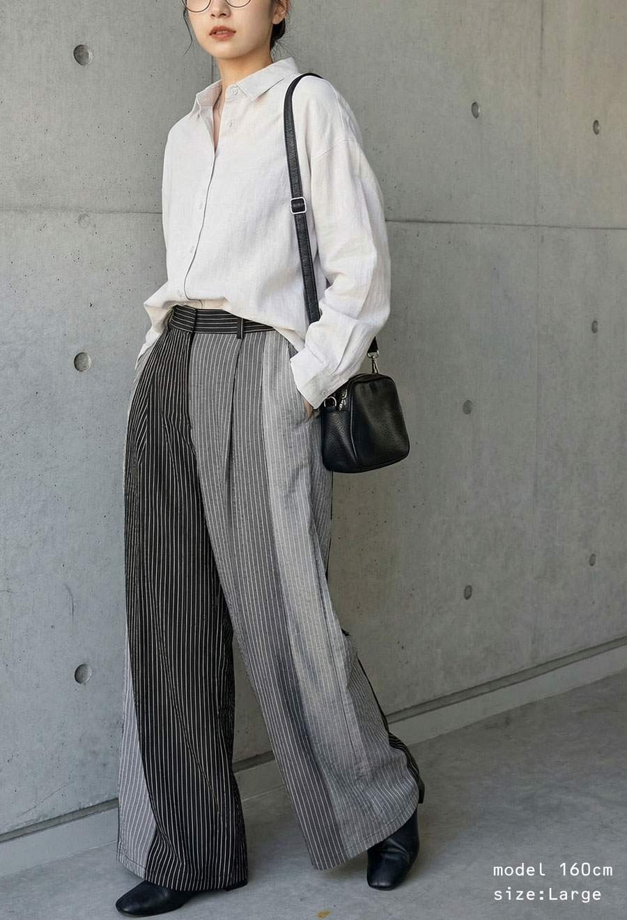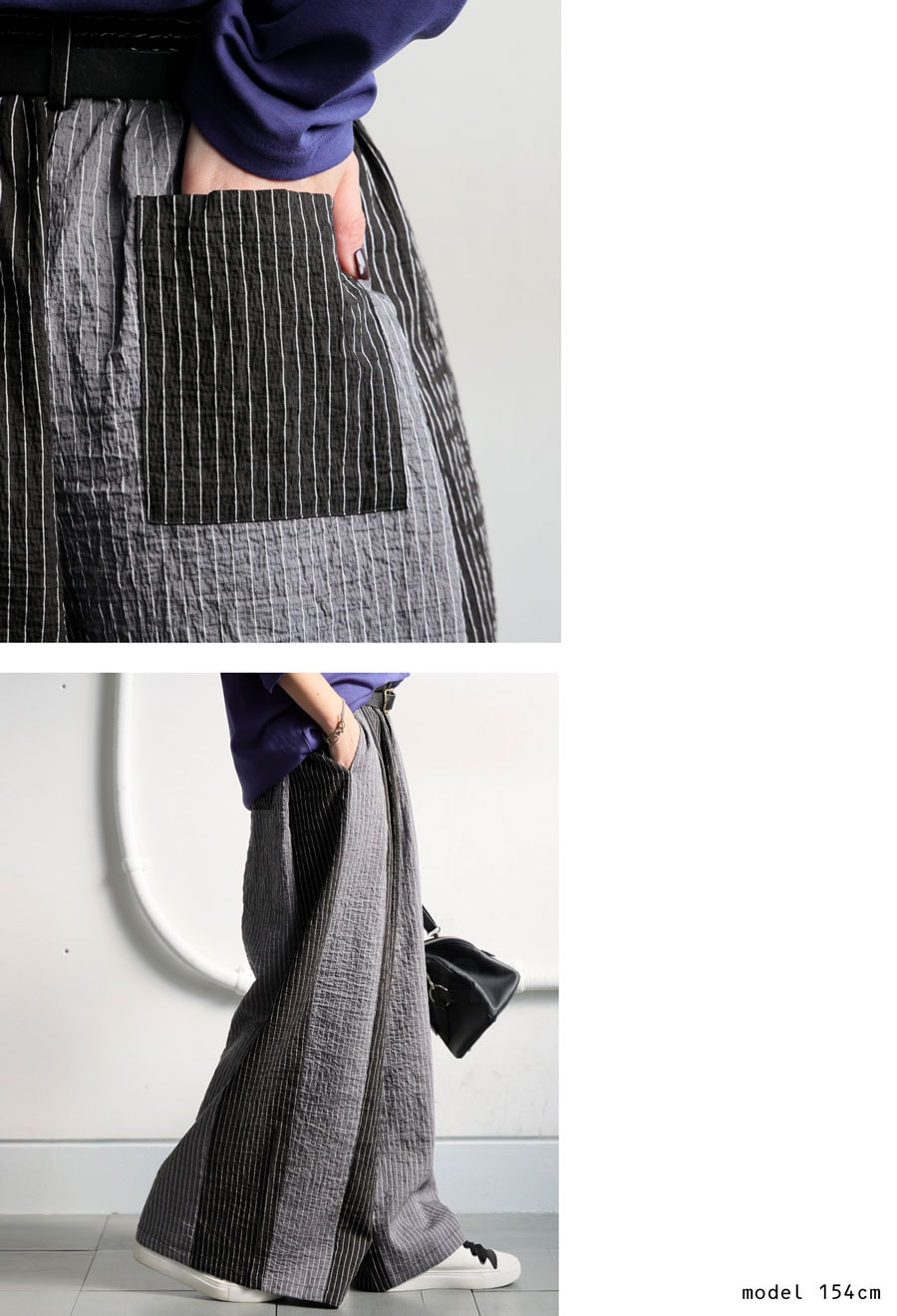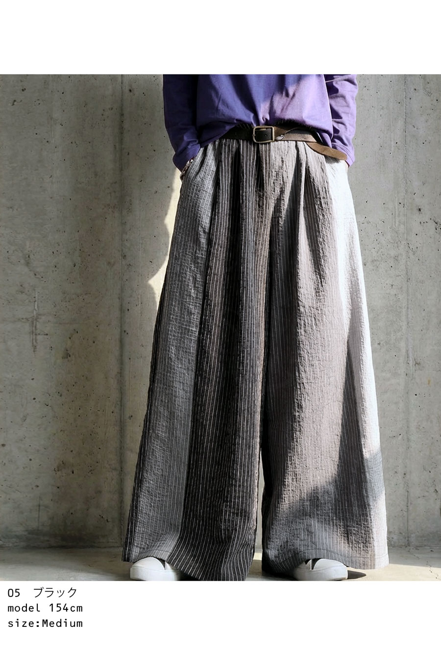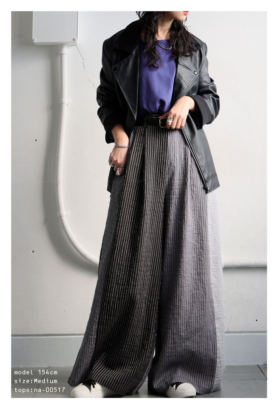 存在感あるストライプ柄を配色で切り替えた、ニュアンス感漂うワイドパンツです。