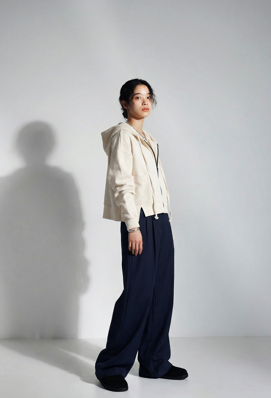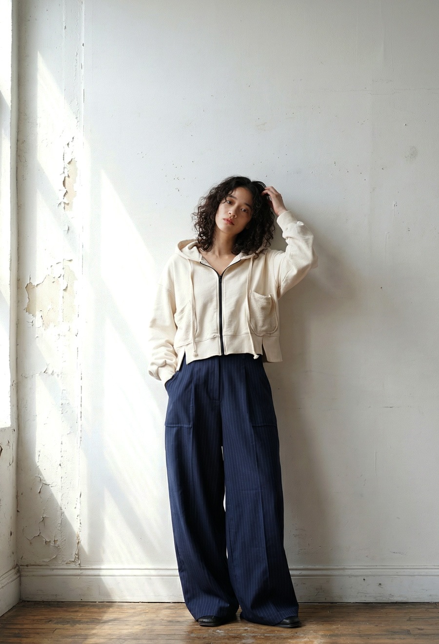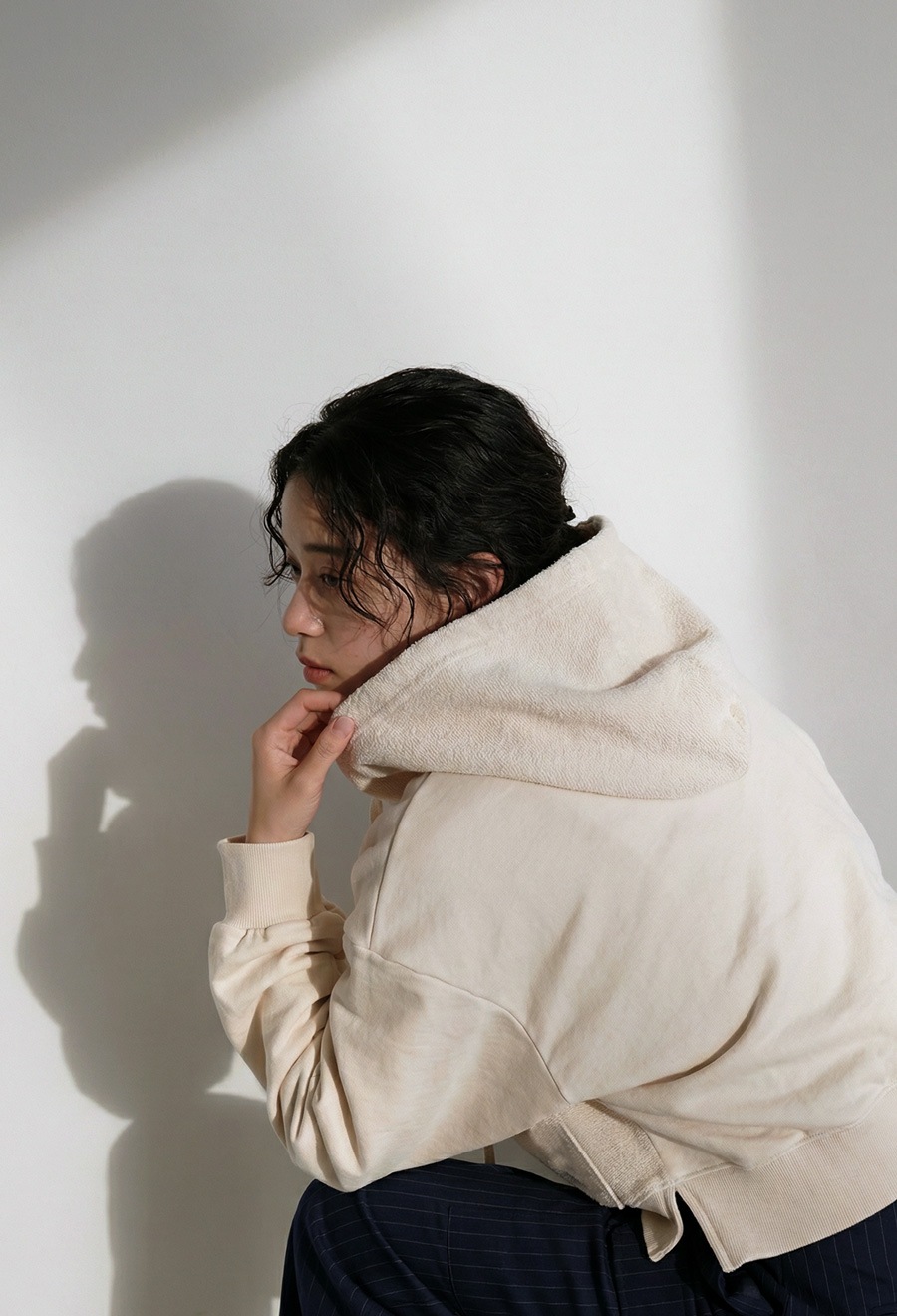 袖丈は手元にかかる長袖で、抜け感のあるルーズな着こなしに。