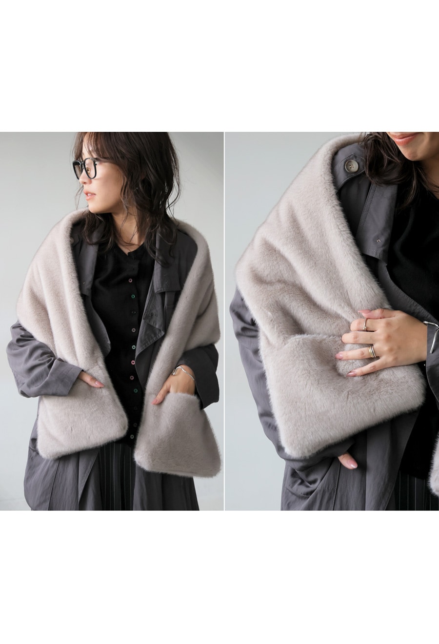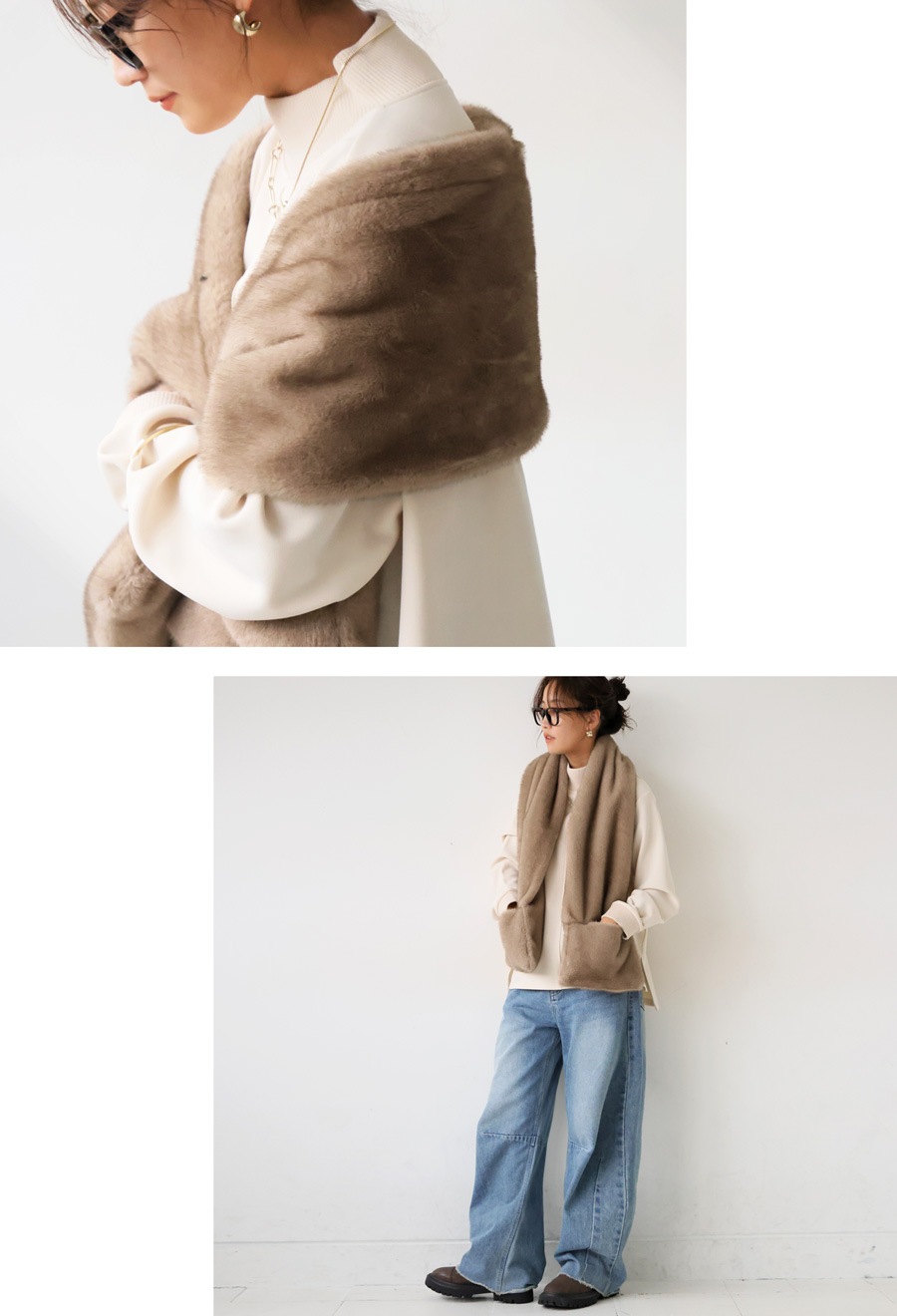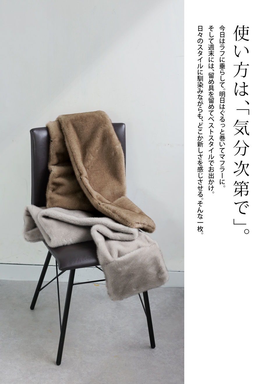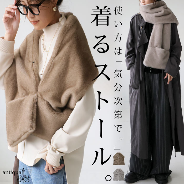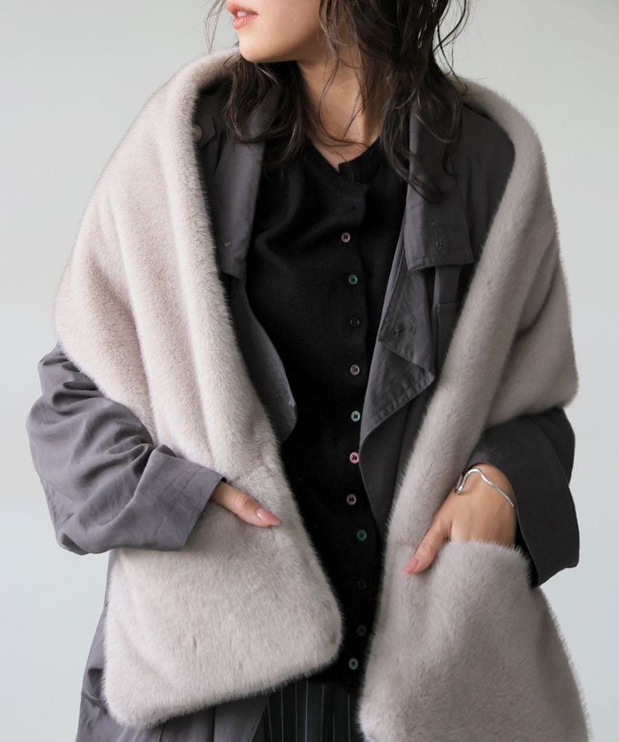 前を留めればファーベスト、肩に羽織ればショール、巻けばマフラーと、3WAYで楽しめる変形アレンジが可能な優秀アイテムです。