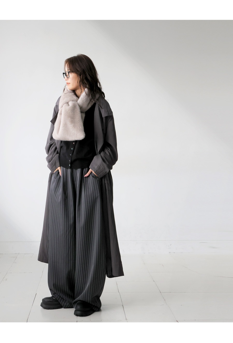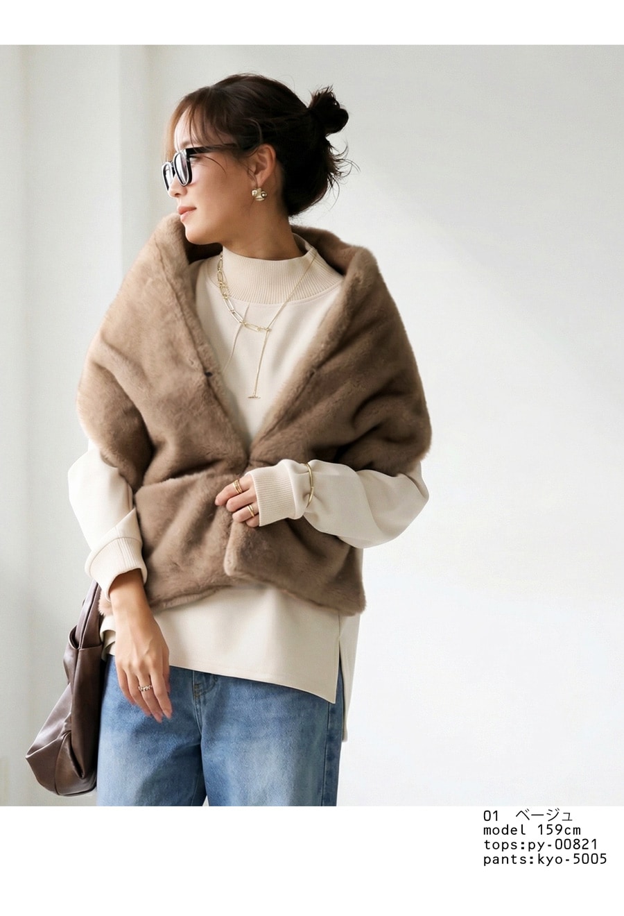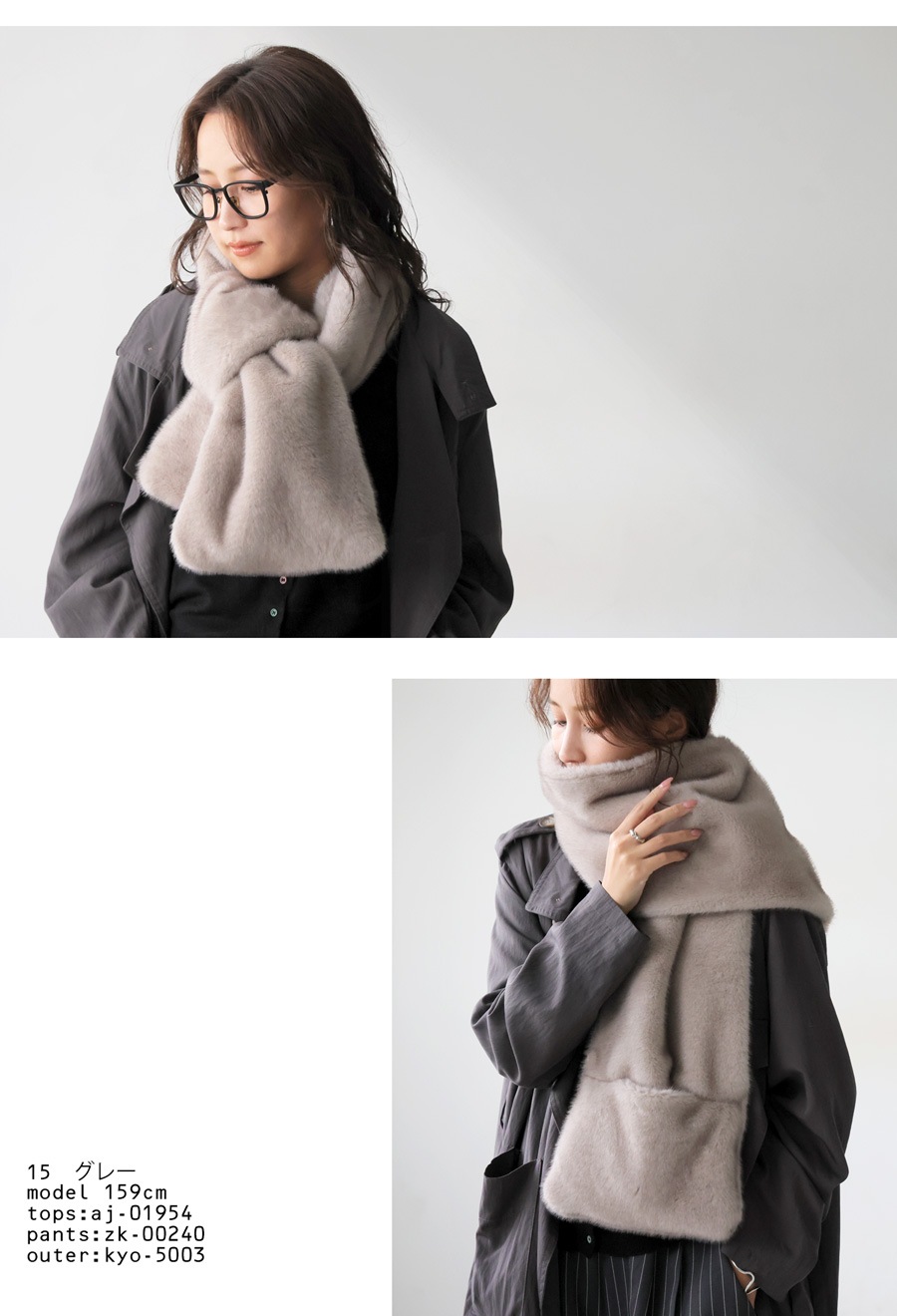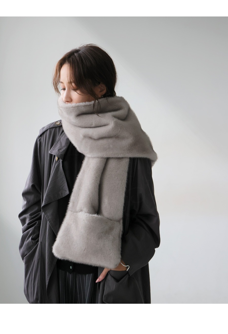 前を留めればファーベスト、肩に羽織ればショール、巻けばマフラーと、3WAYで楽しめる変形アレンジが可能な優秀アイテムです。