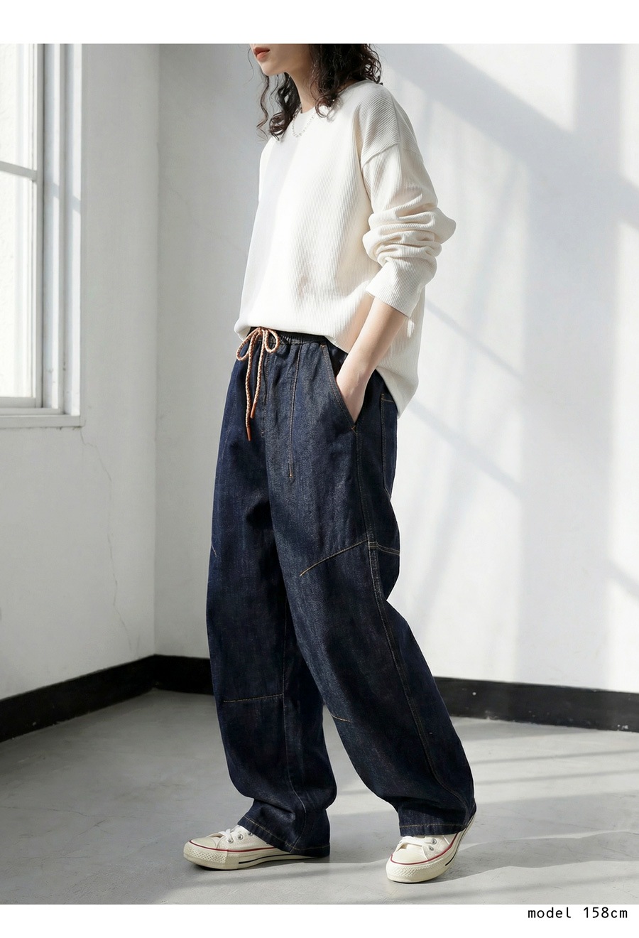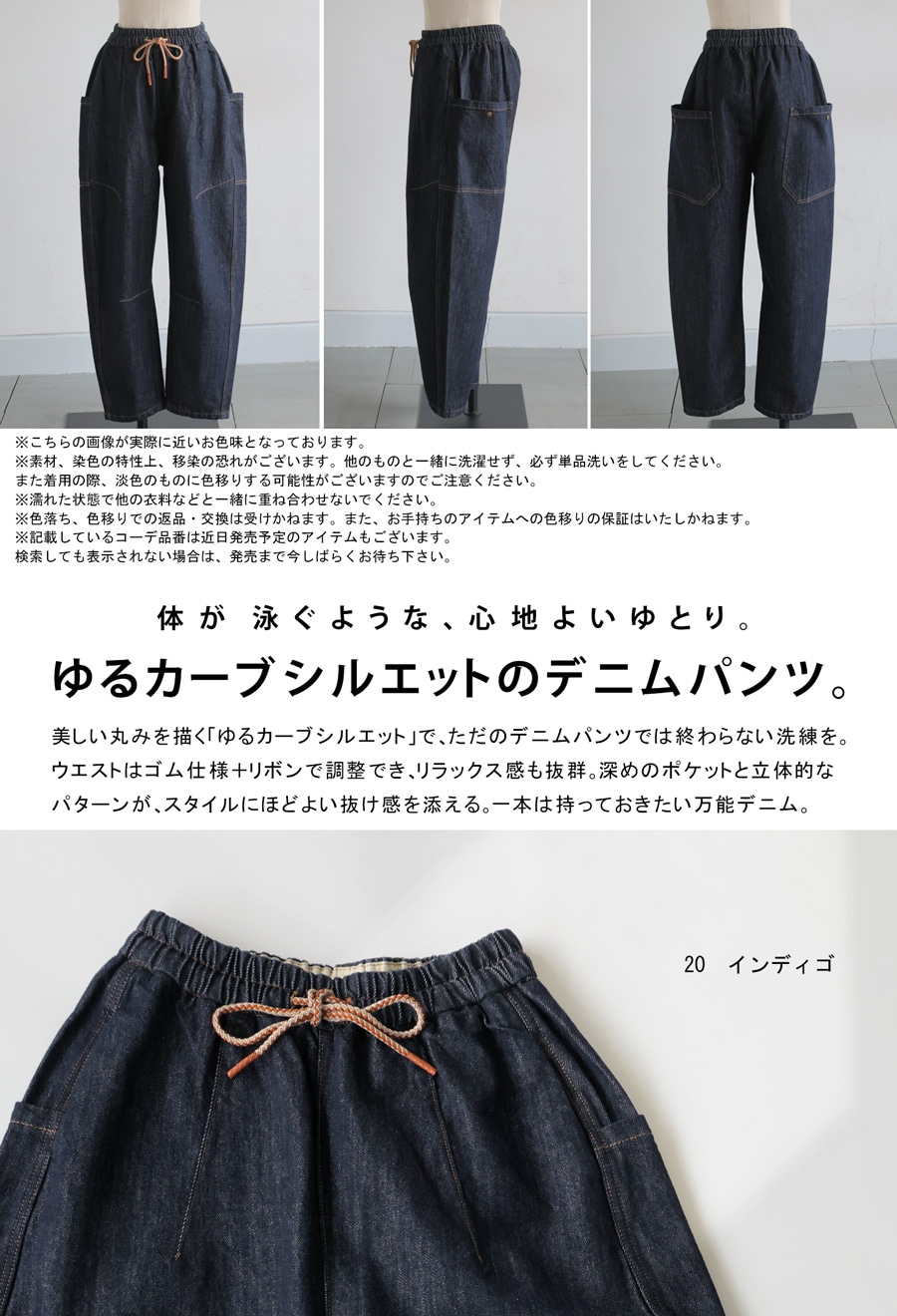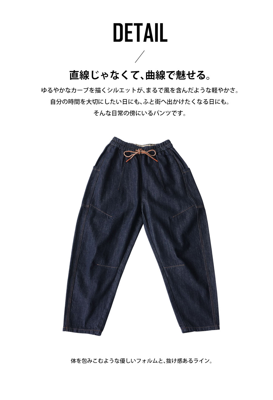 絶妙なカーブラインで立体感を引き出す、穿くだけで洒落感の出るゆったりデニムパンツです。