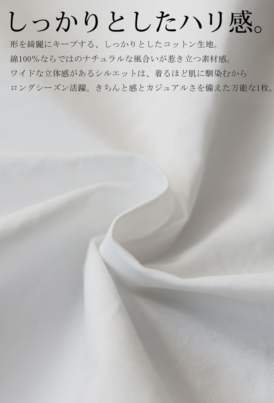 素材には綿(コットン)100%を使用し、しっかりとしたハリ感がありながらも、ナチュラルな風合いで心地よく着用できます。