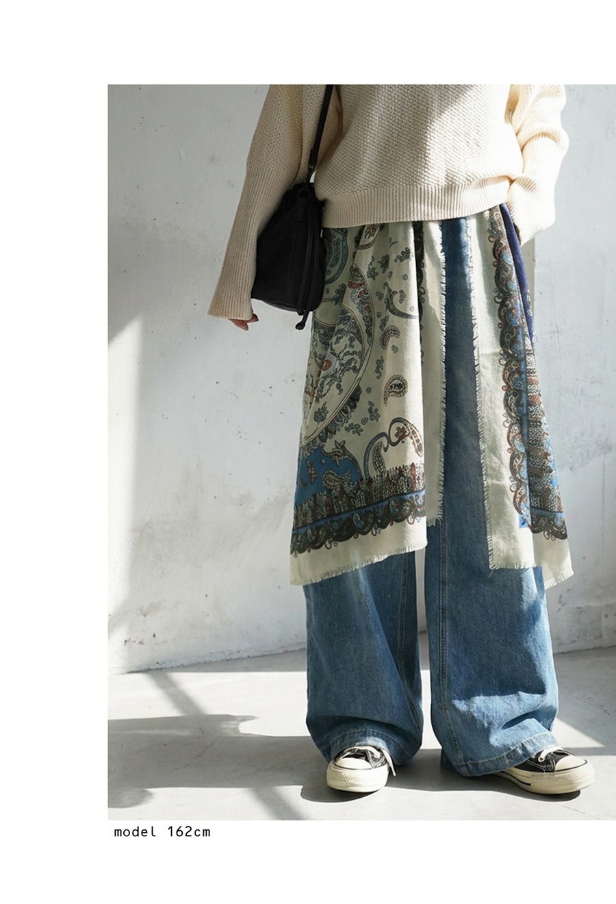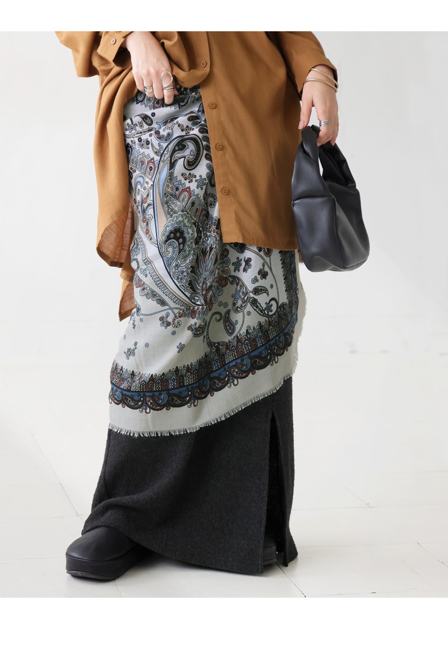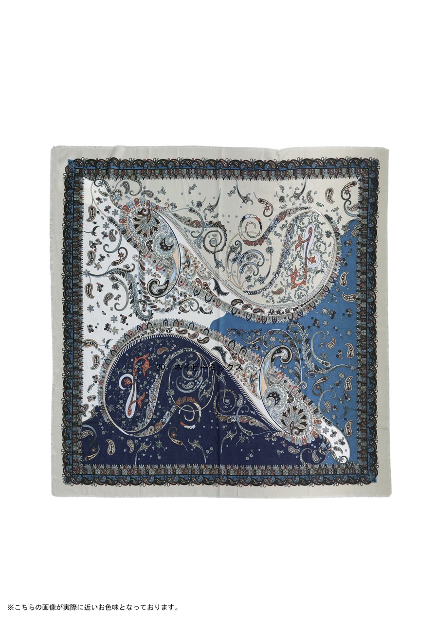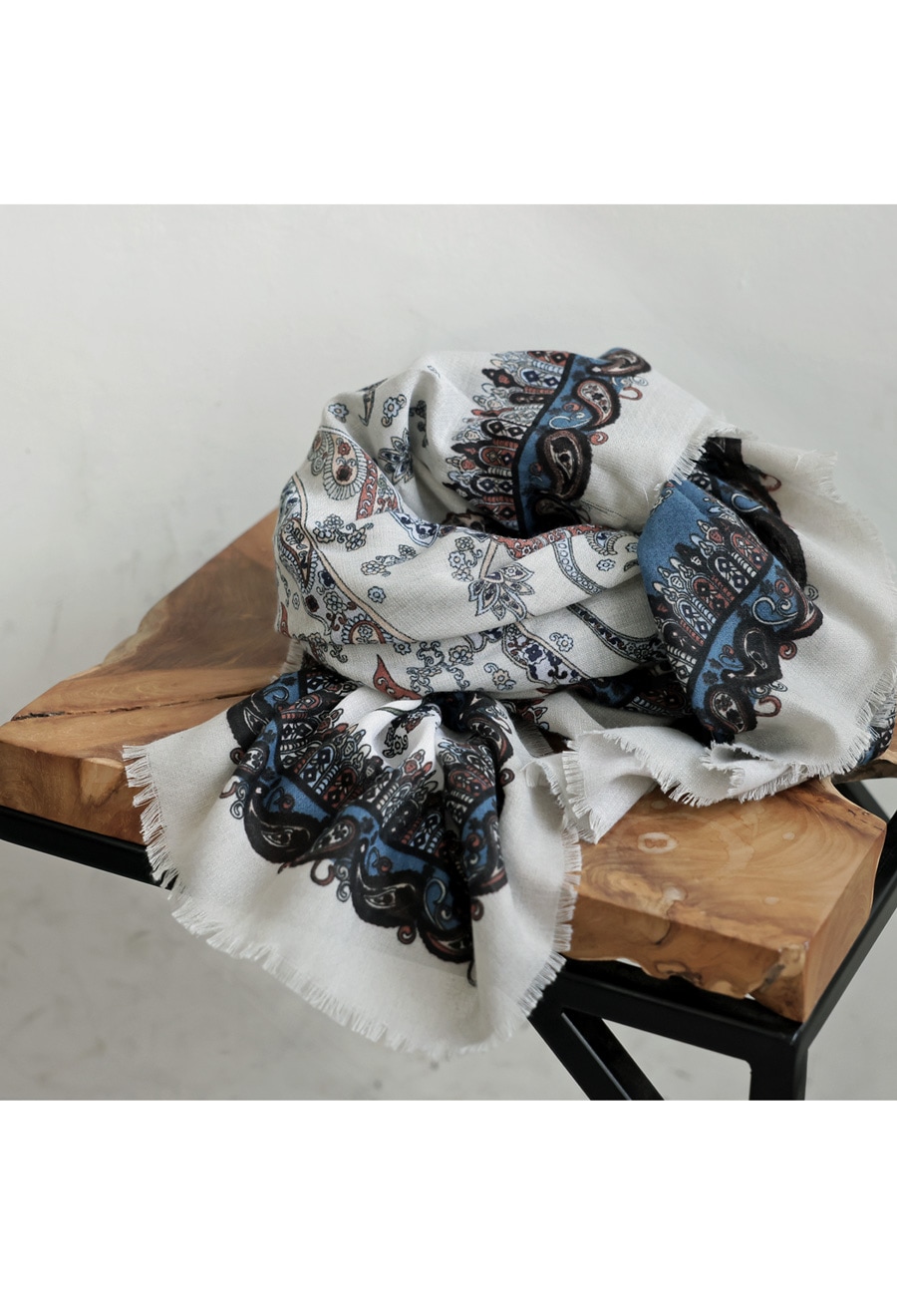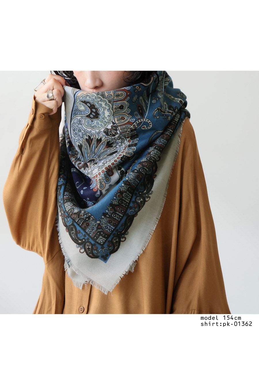 顔まわりを華やかに彩る、印象的なペイズリー柄の大判ストール(スカーフ)です。
