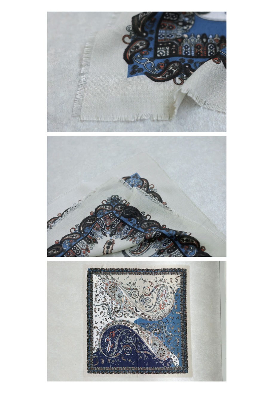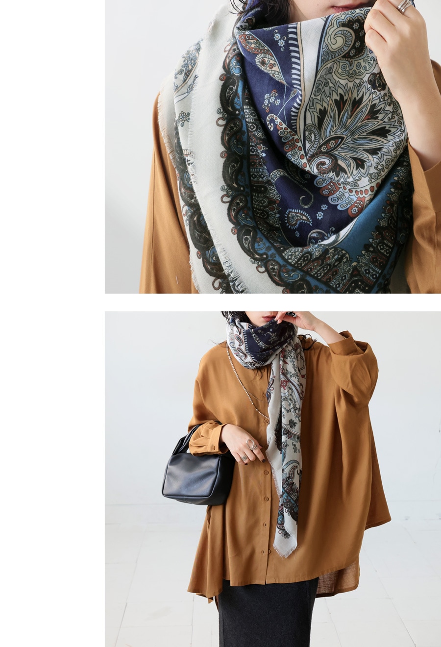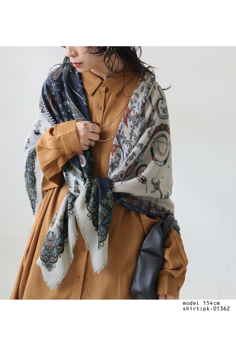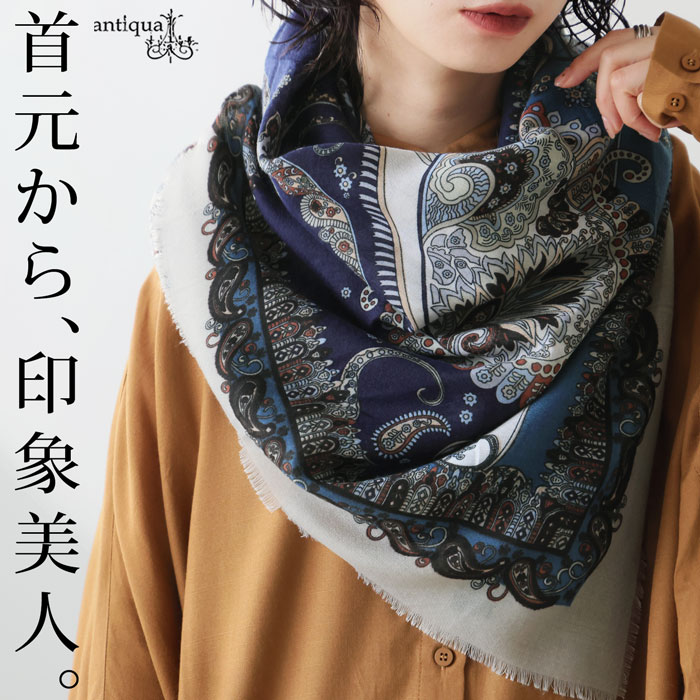 首元に巻いたり、羽織ったり、アレンジ次第で様々な表情が楽しめる正方形の形状で、スタイリングの幅が広がります。