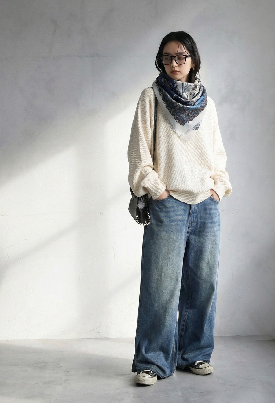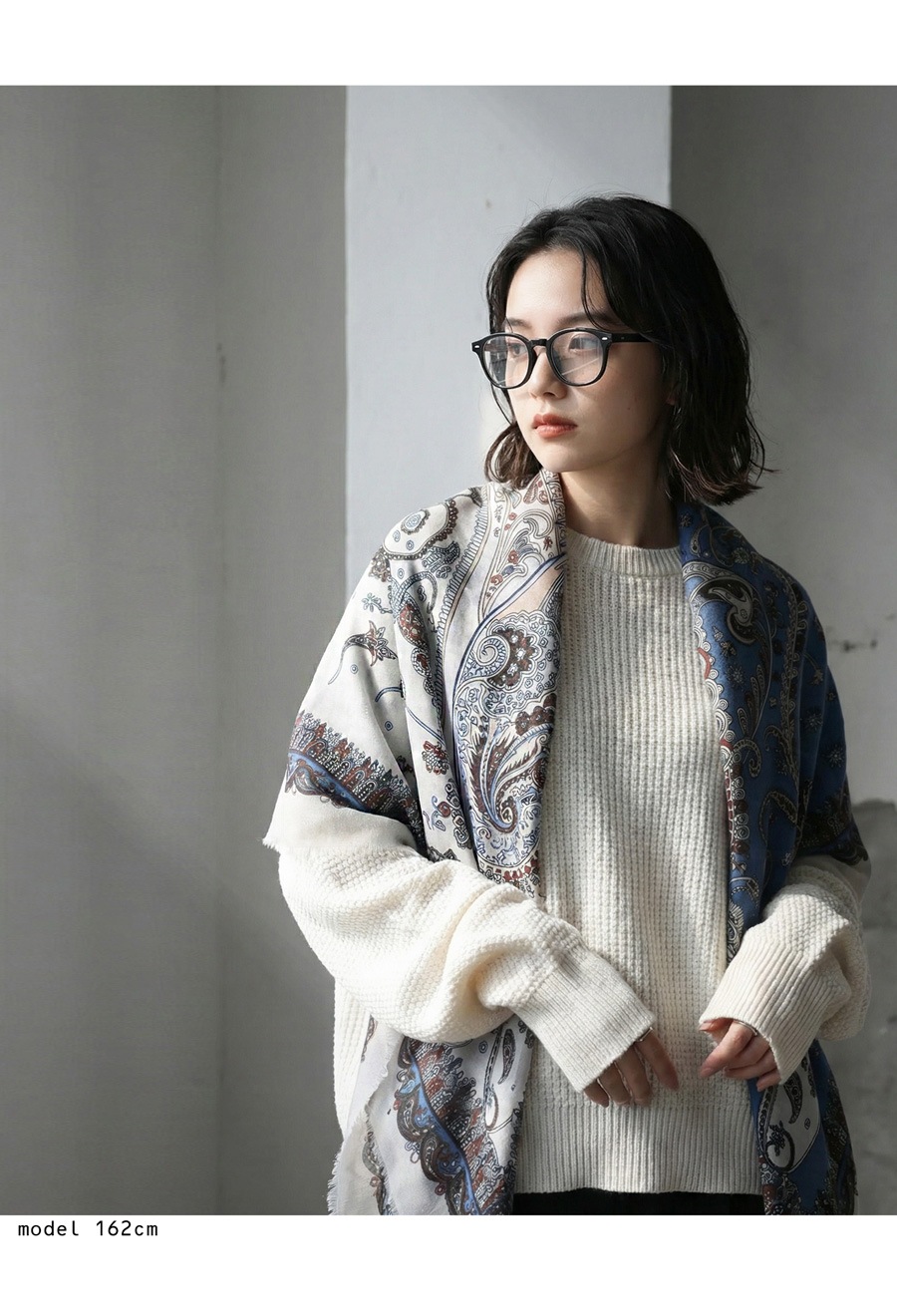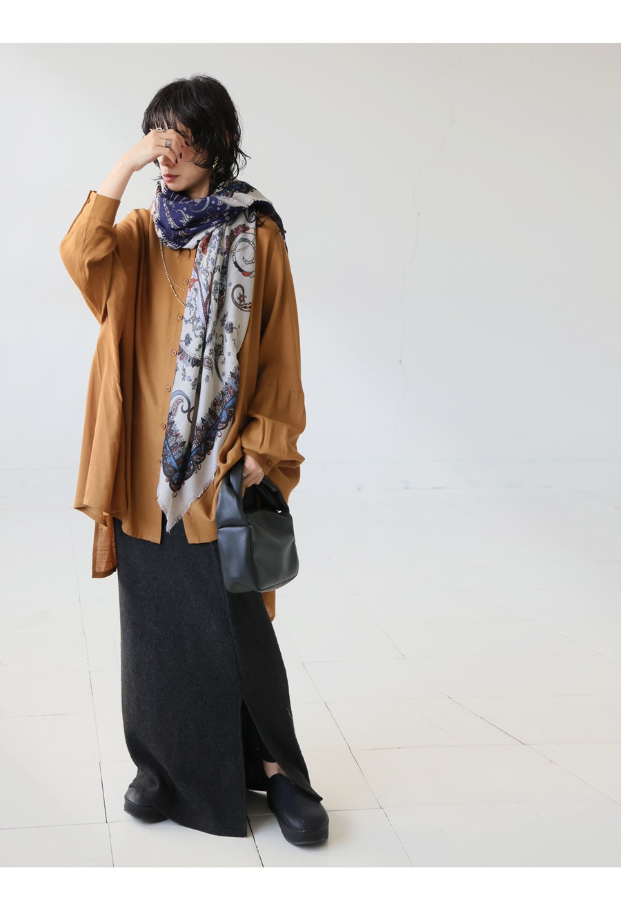 首元に巻いたり、羽織ったり、アレンジ次第で様々な表情が楽しめる正方形の形状で、スタイリングの幅が広がります。