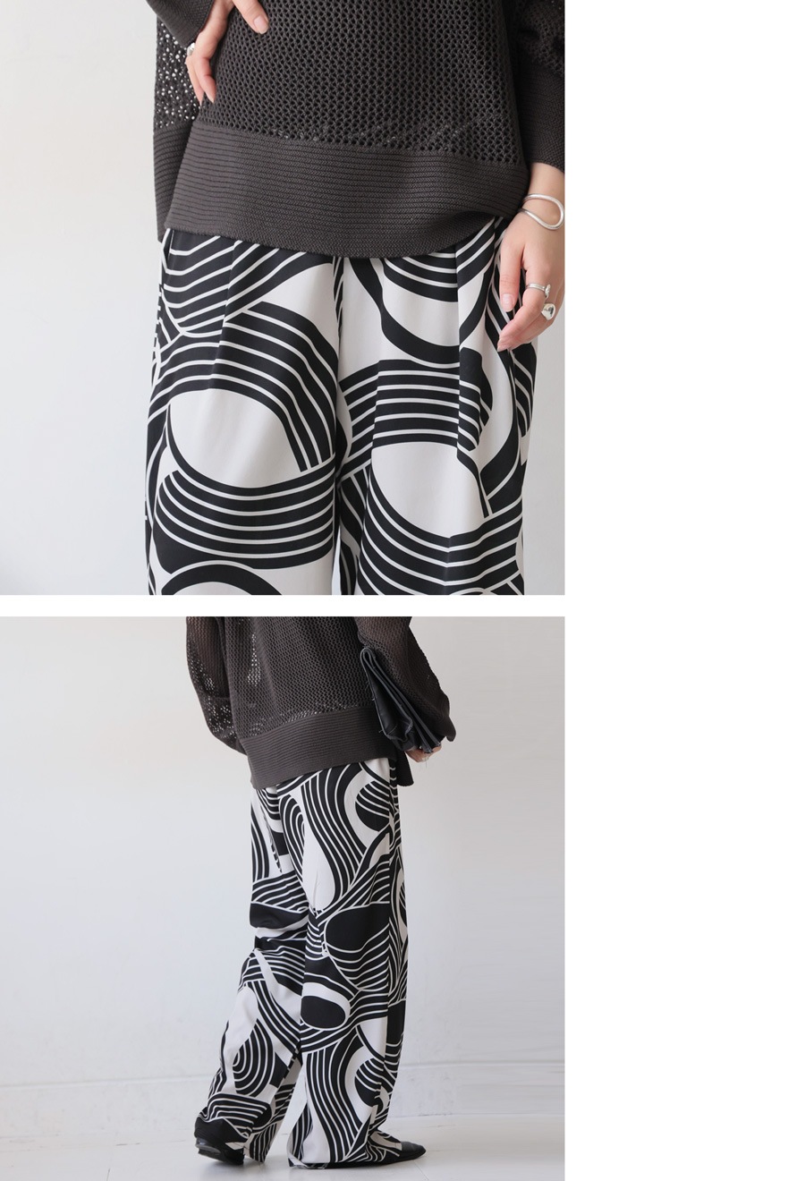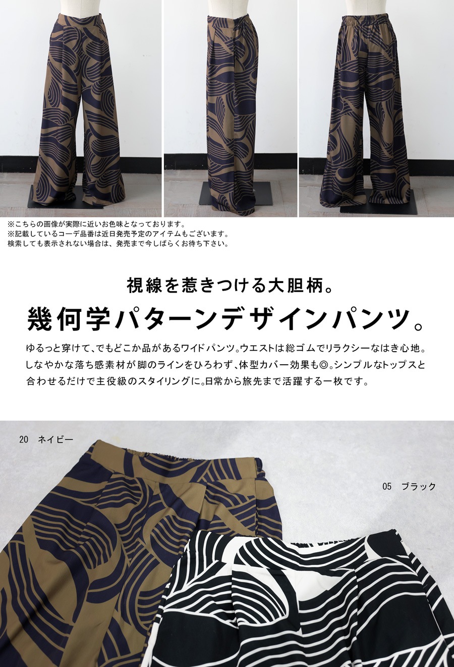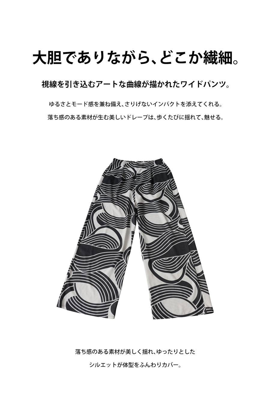 大胆な幾何学柄が視線を惹きつける、主役級のワイドパンツが登場しました。