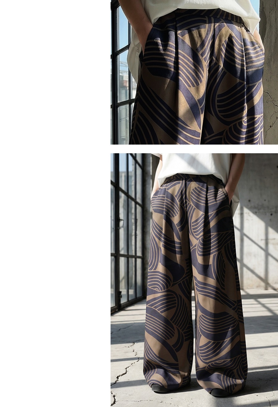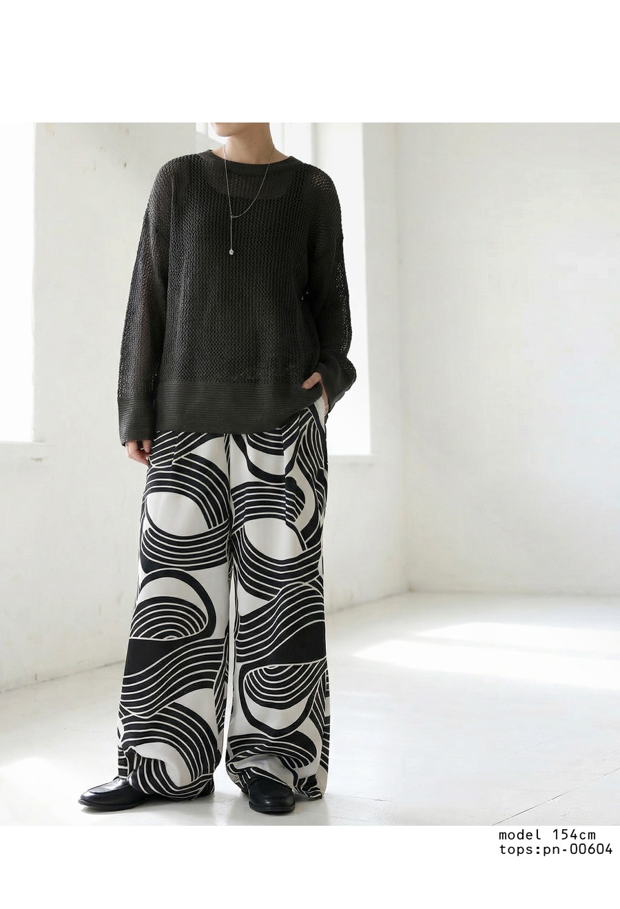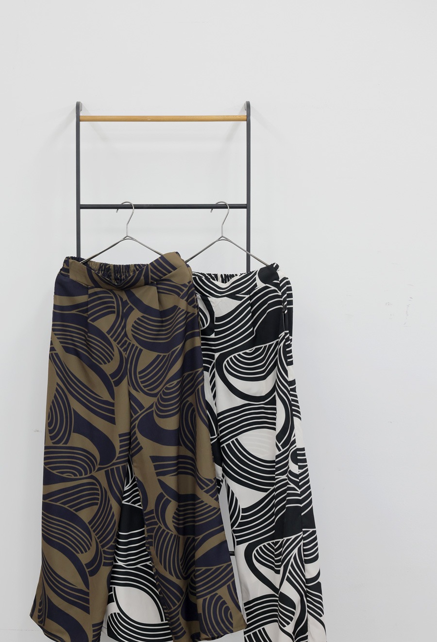 大胆な幾何学柄が視線を惹きつける、主役級のワイドパンツが登場しました。