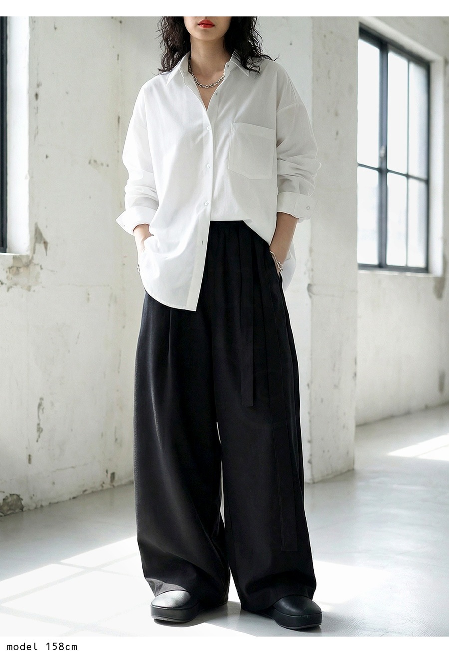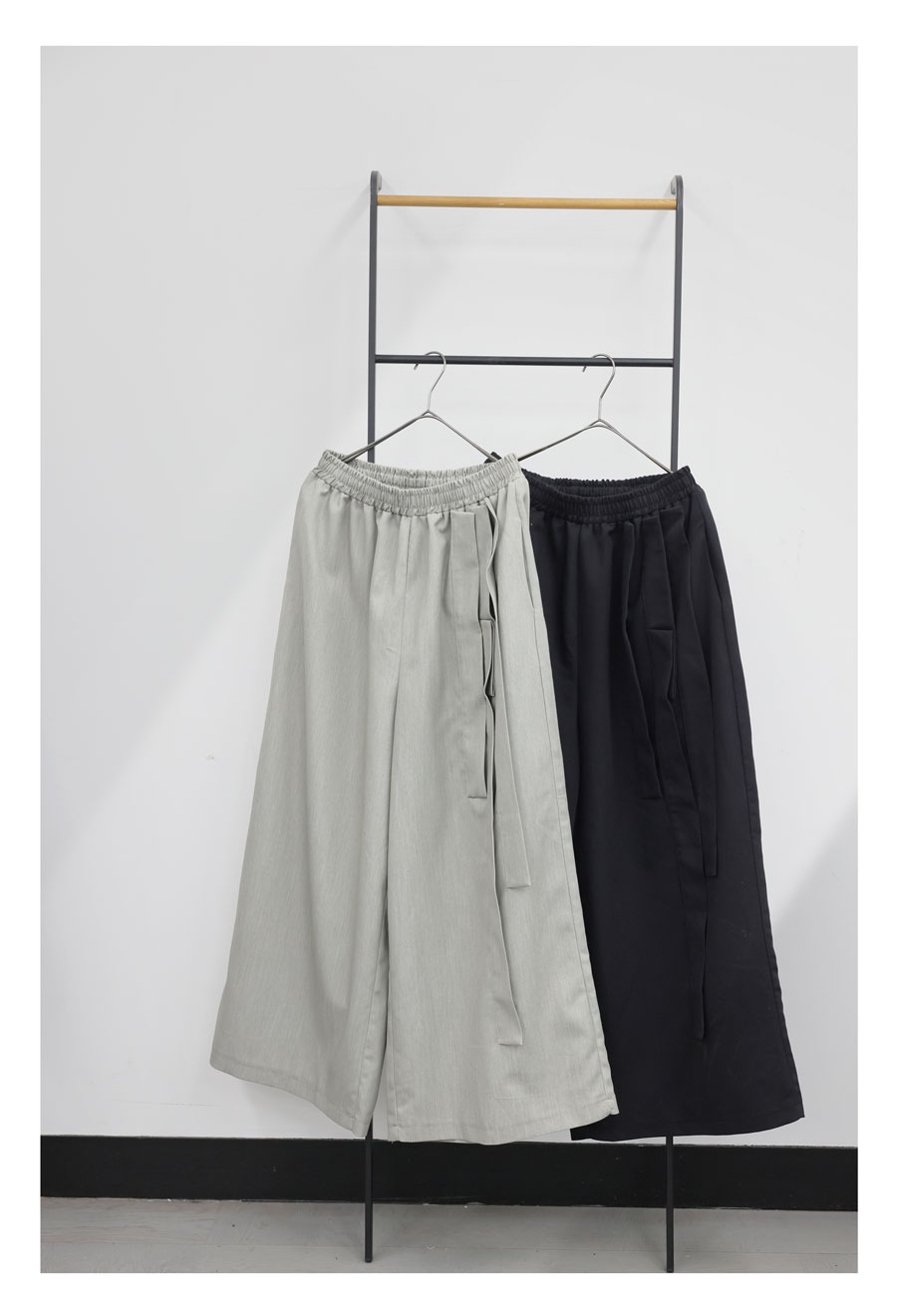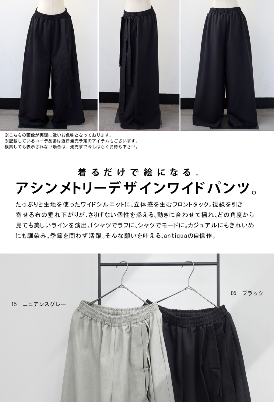 立体タックが陰影を生み出すアシンメトリーデザインのワイドパンツです。