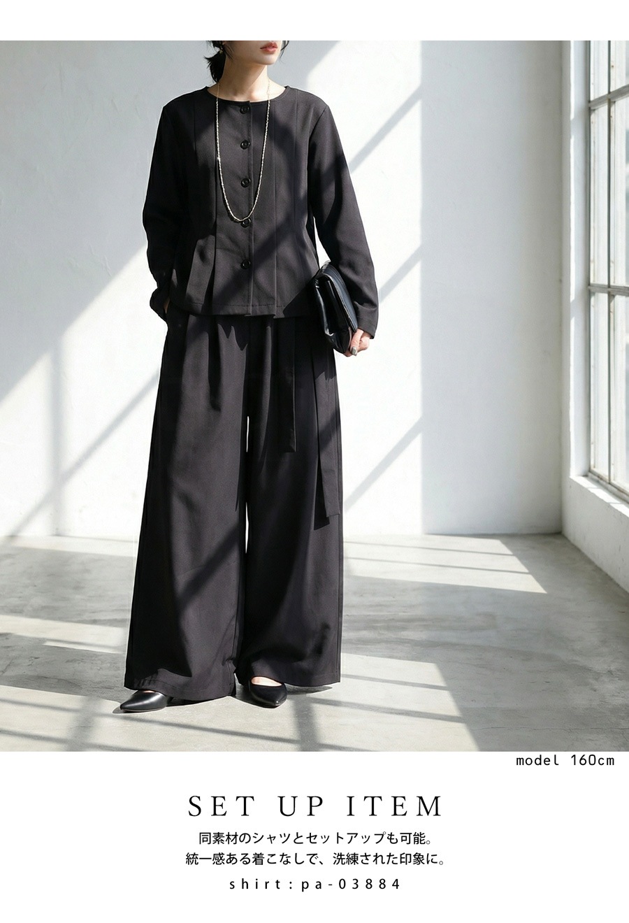 同素材シャツ(品番:PA-03884)とのセットアップも可能で、スタイルに統一感が生まれます。