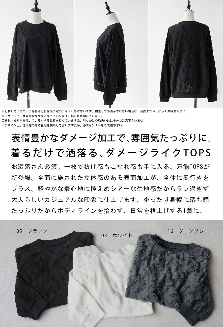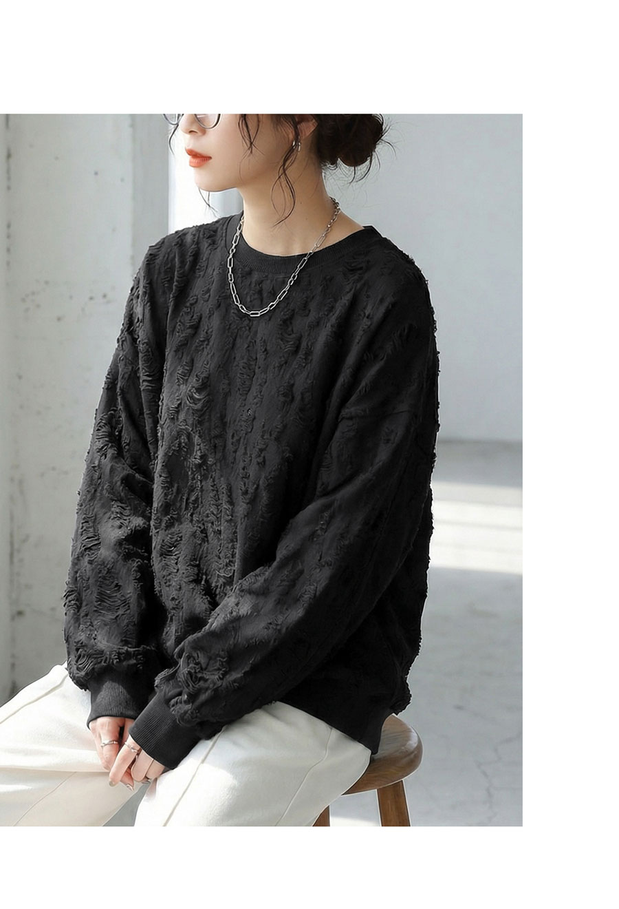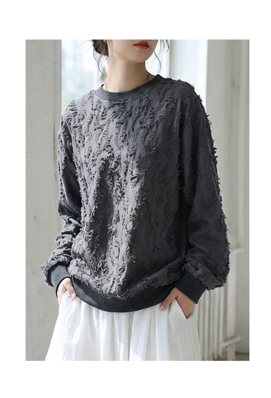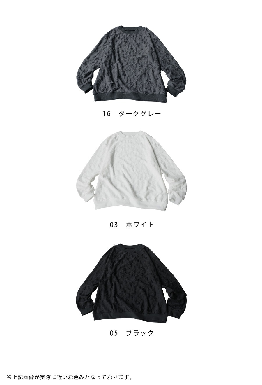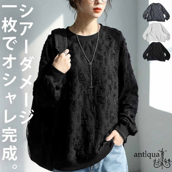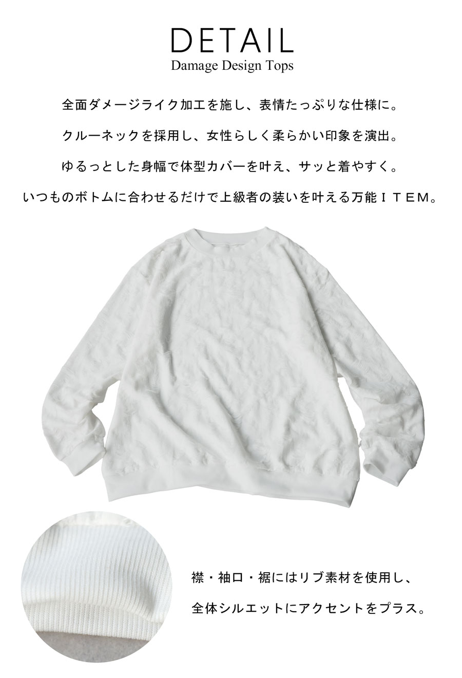 立体感のあるダメージライク加工が魅力の長袖トップスです。