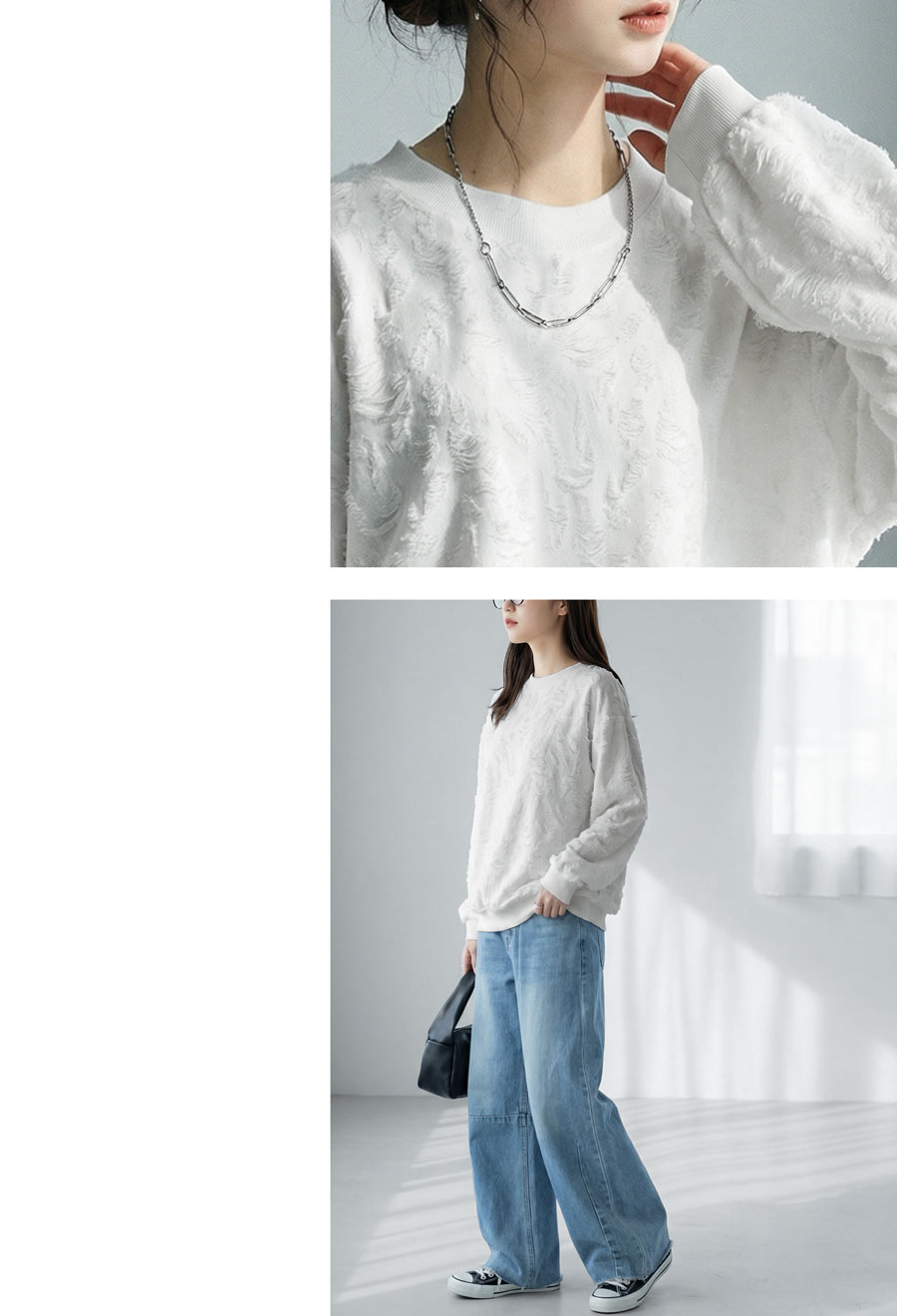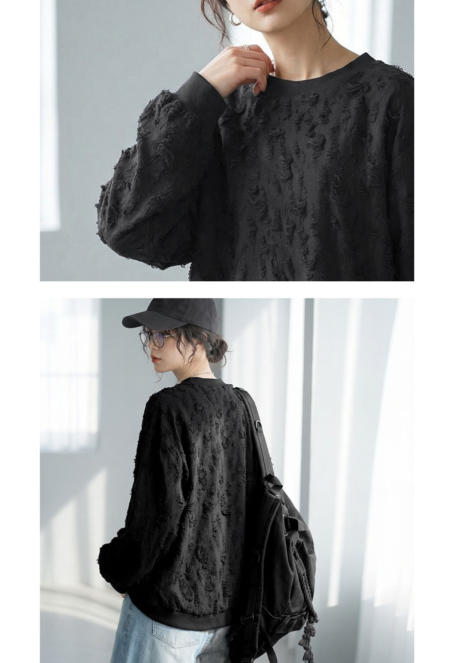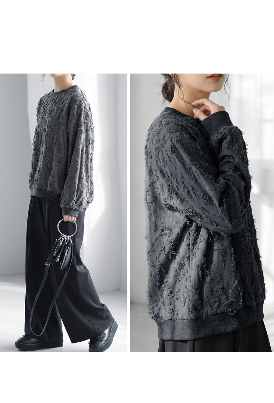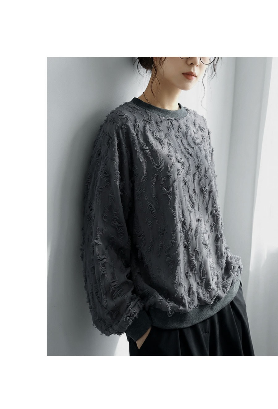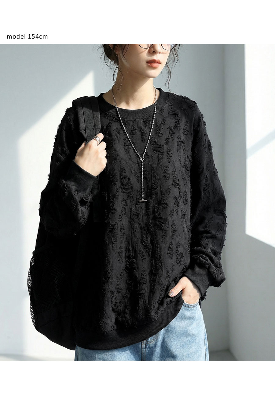 立体感のあるダメージライク加工が魅力の長袖トップスです。