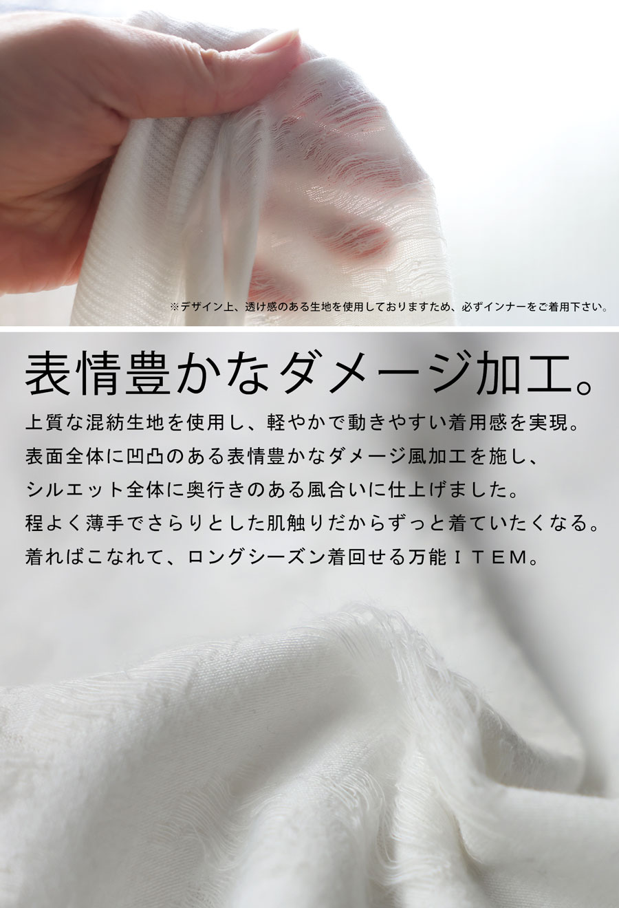 着心地の良さを追求した軽やかな素材感で、デイリー使いはもちろんロングシーズン活躍します。
