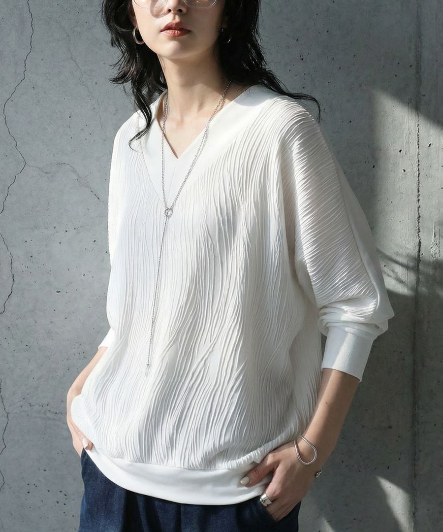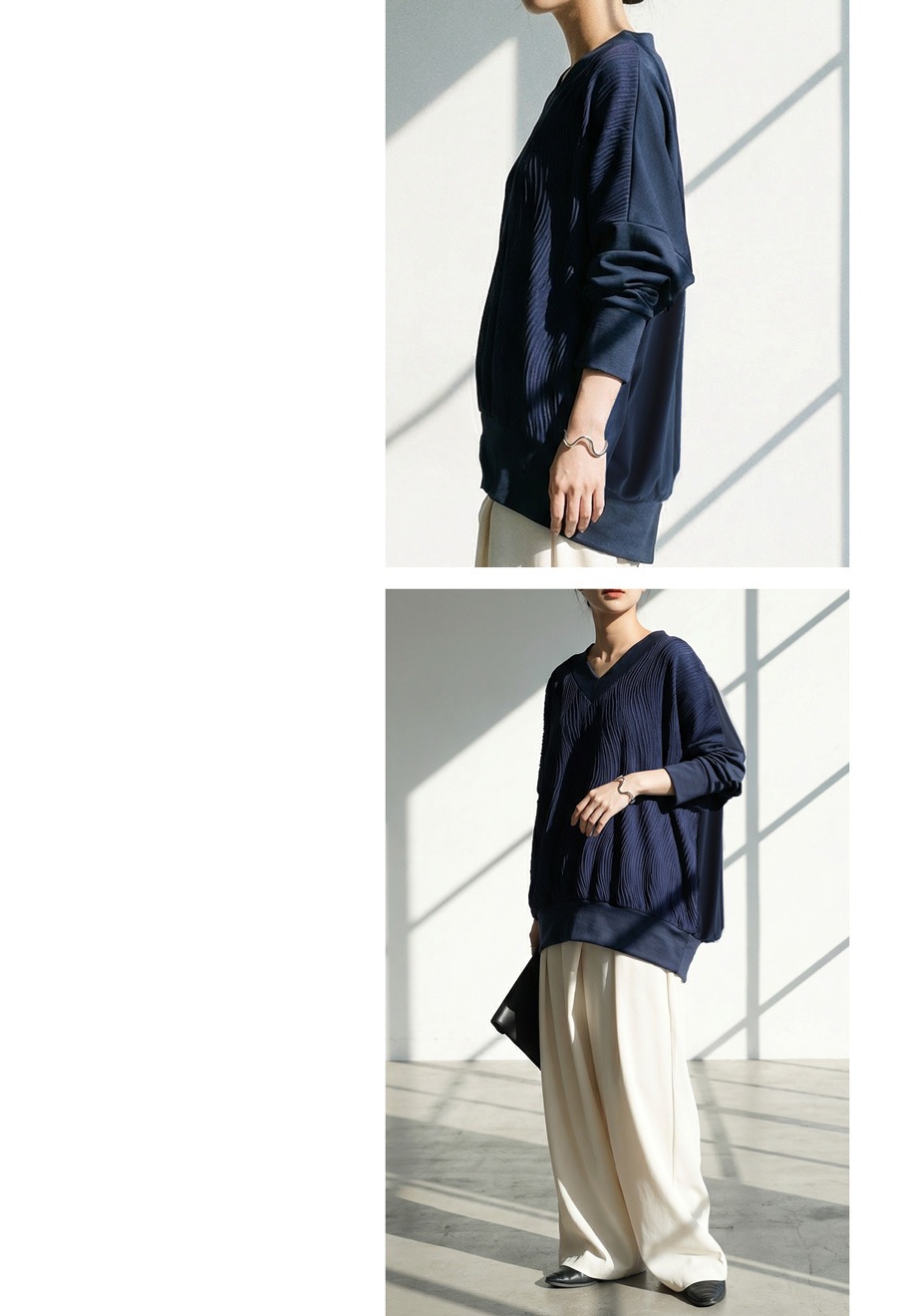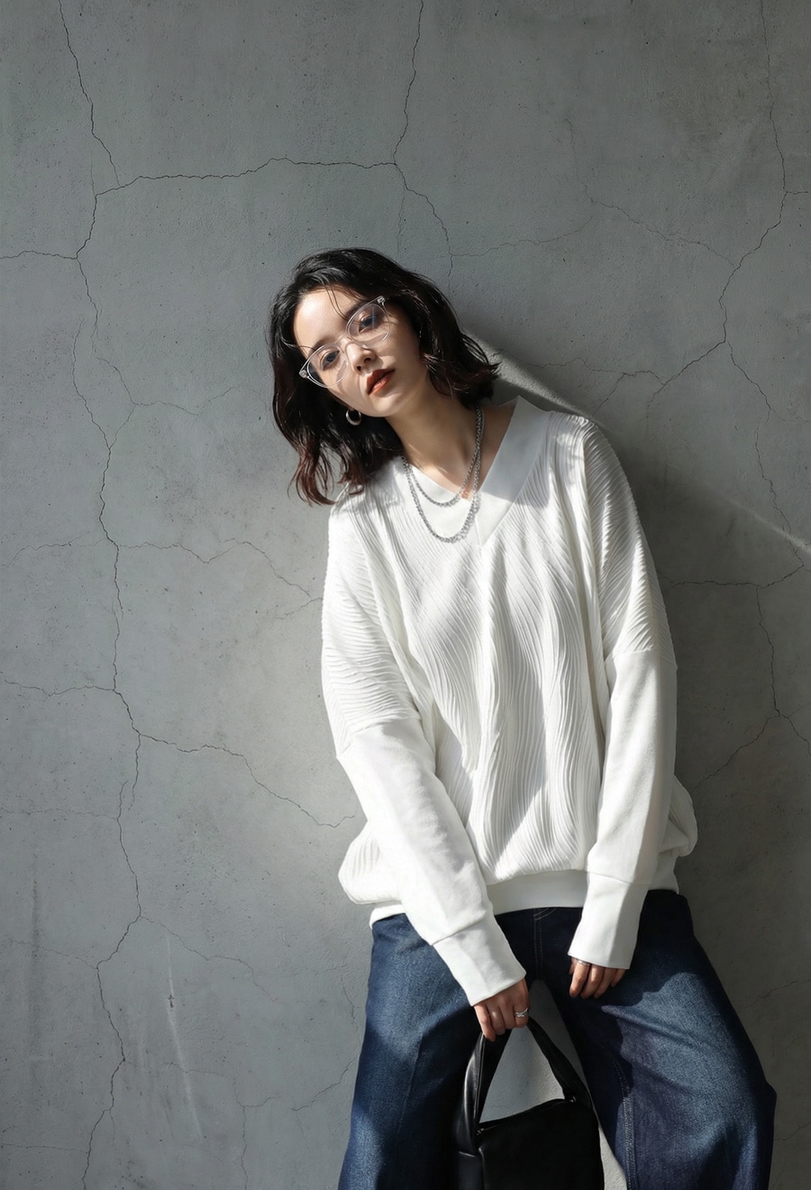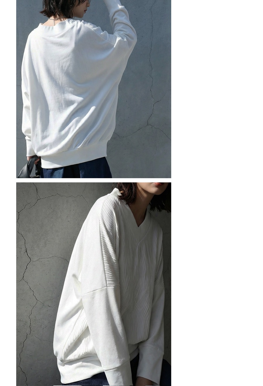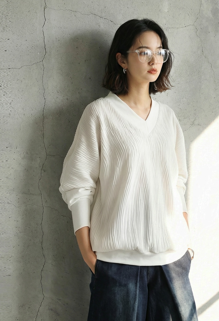 ネックラインはすっきりとしたVネックで、顔まわりに抜け感をプラス。