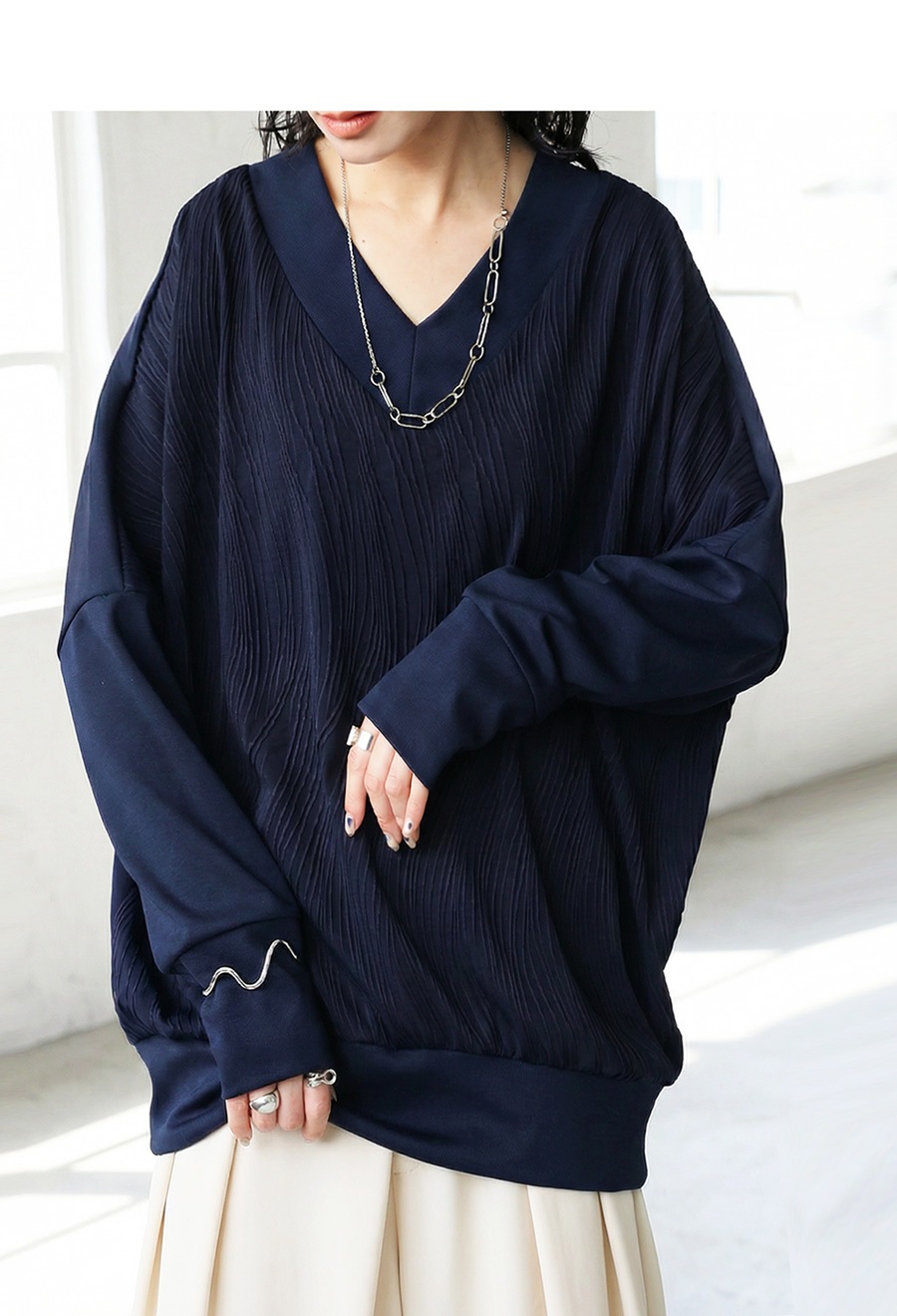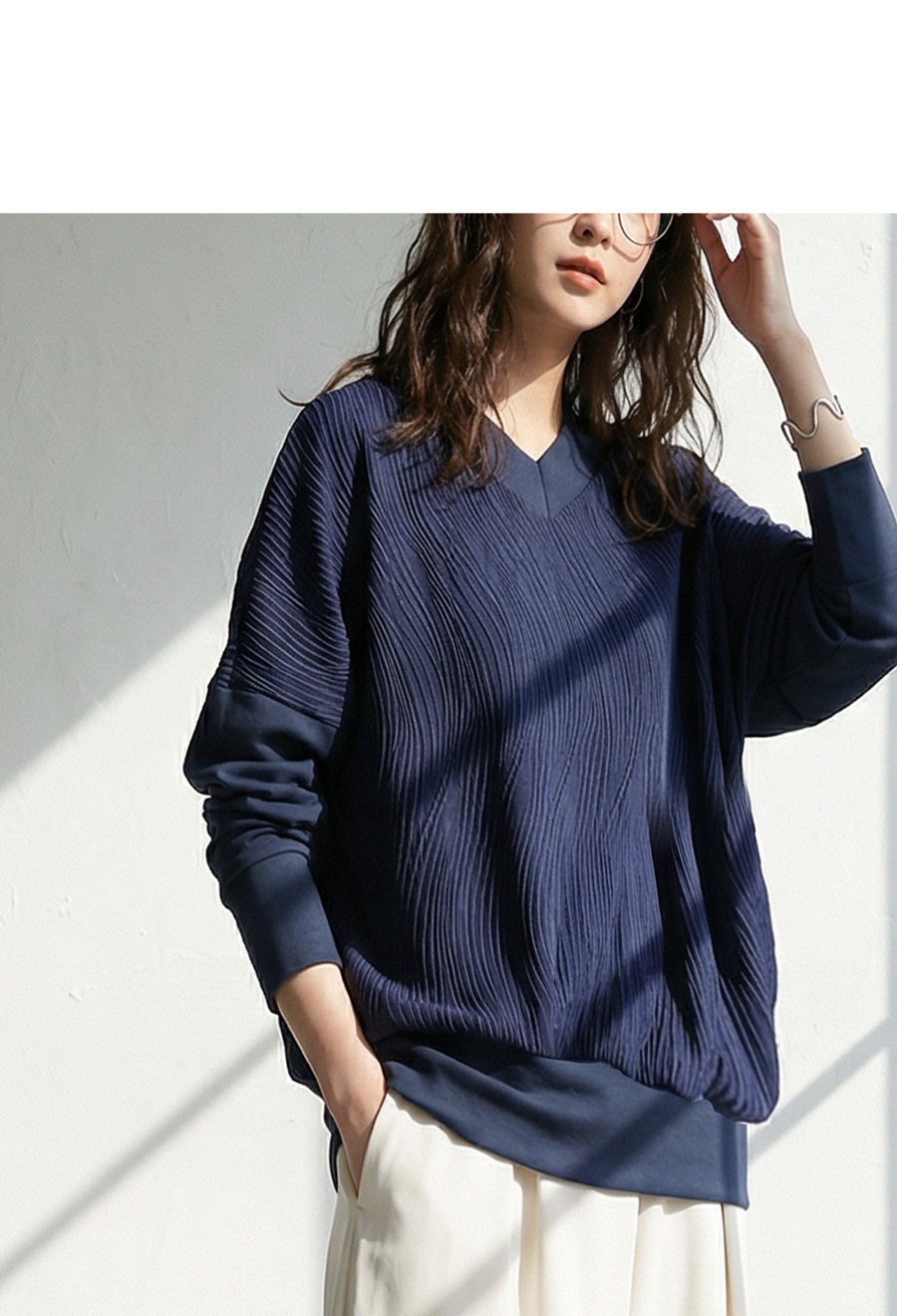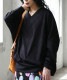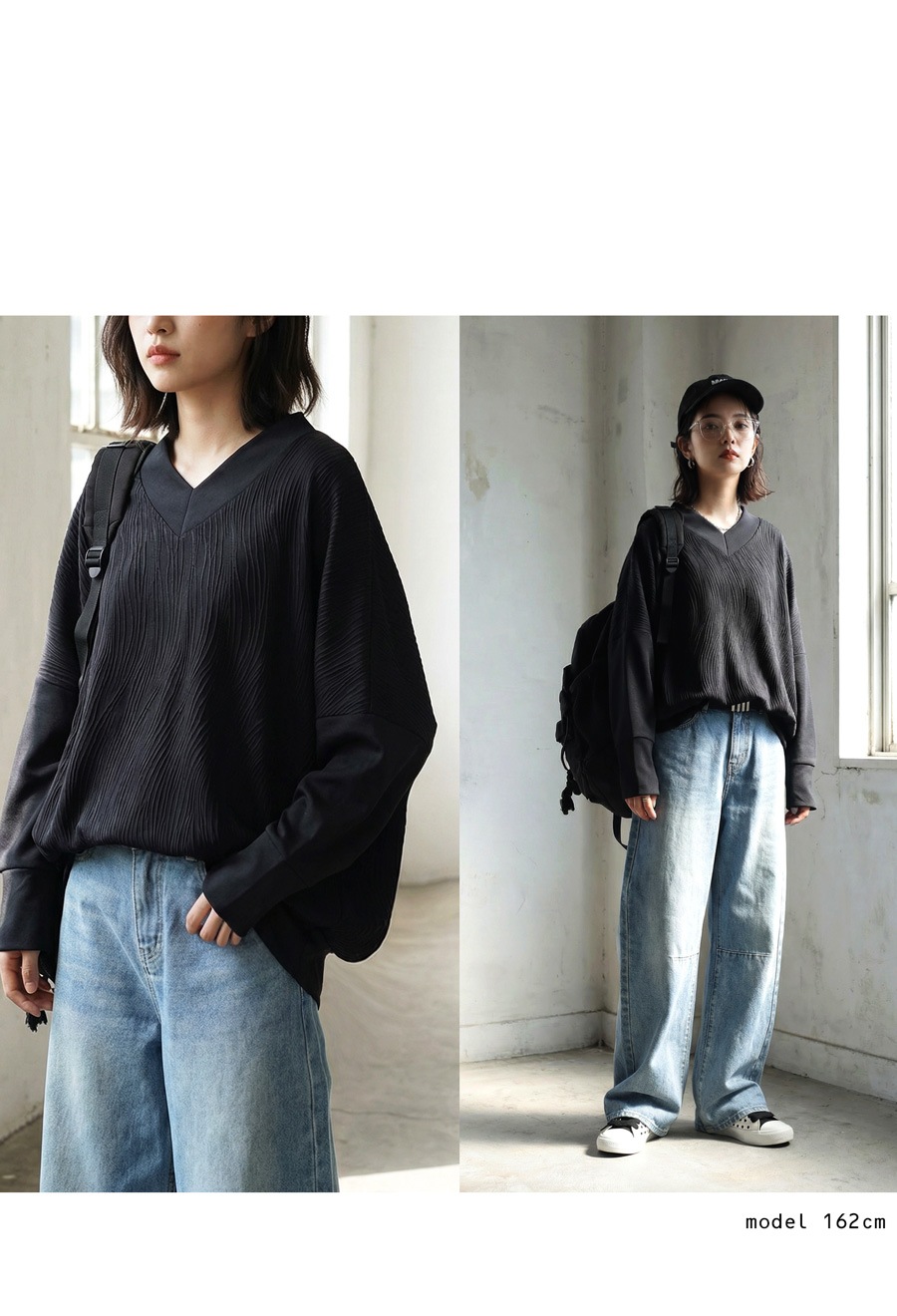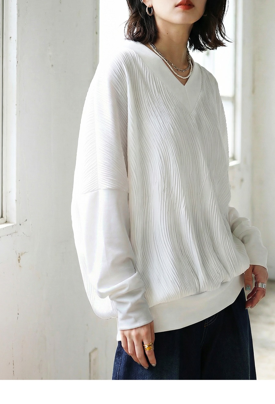 ネックラインはすっきりとしたVネックで、顔まわりに抜け感をプラス。