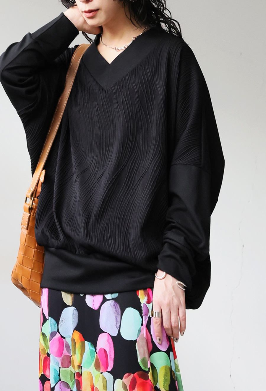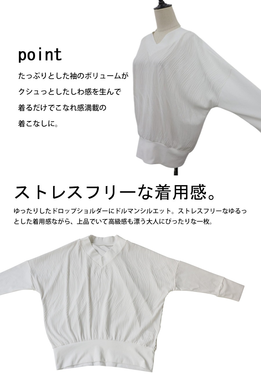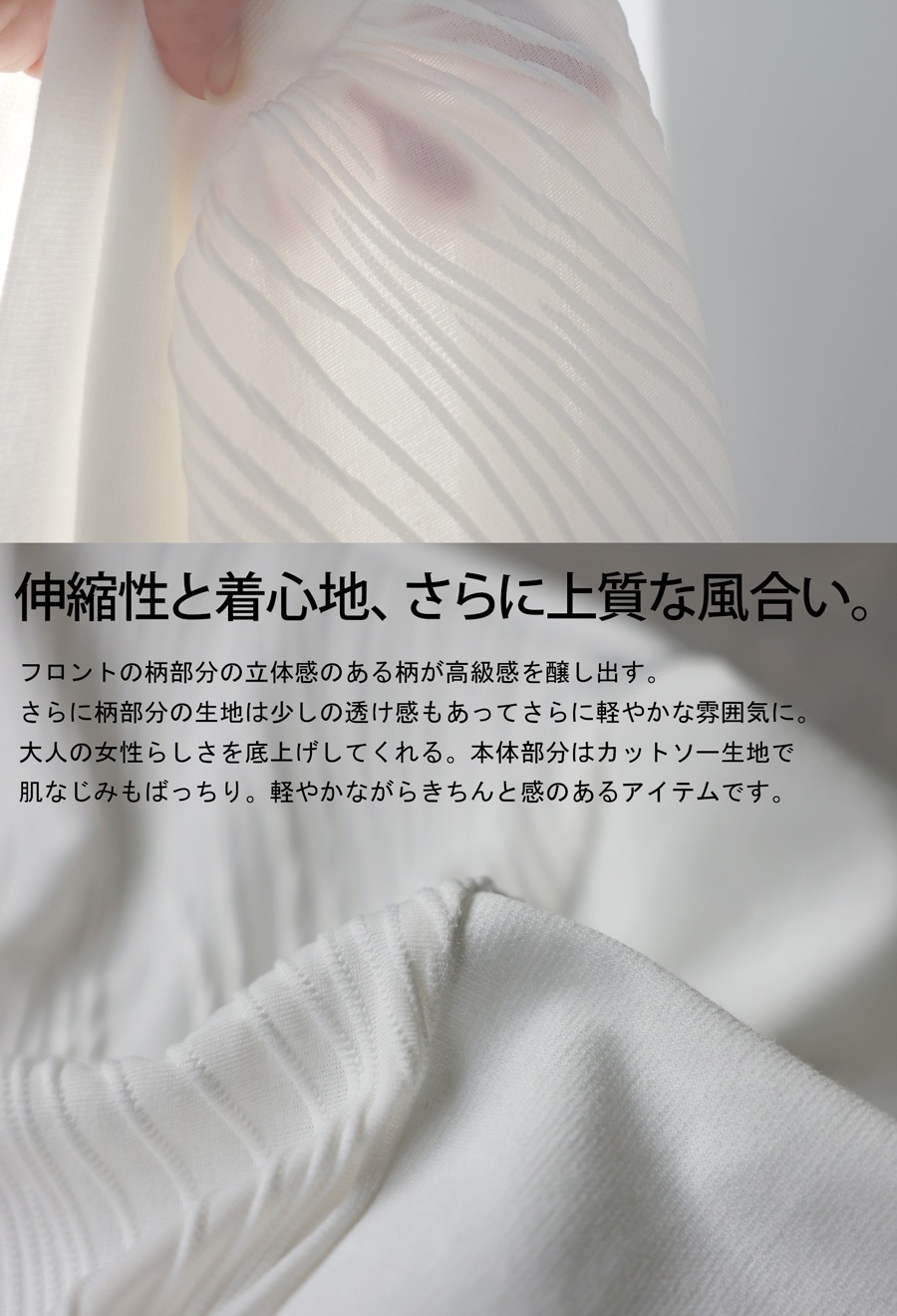 立体模様(柄)が映える前面デザインが魅力のデザイントップスは、大人かわいい雰囲気を演出してくれる一枚です。