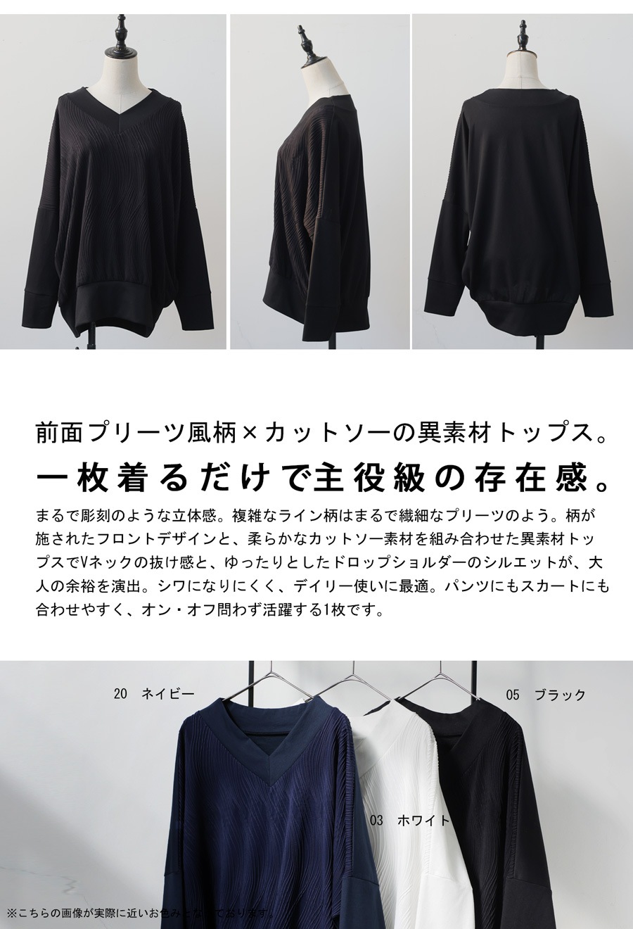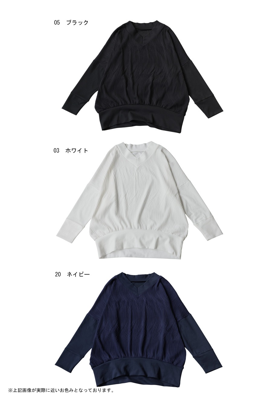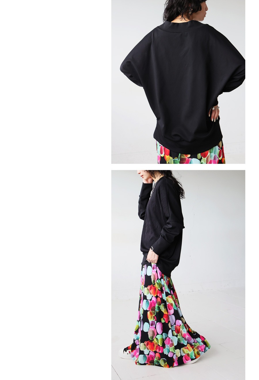 袖丈は長袖、柔らかなカットソー素材で構成された異素材切り替えが特徴的です。
