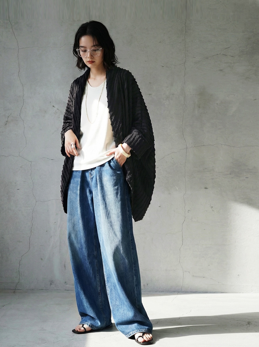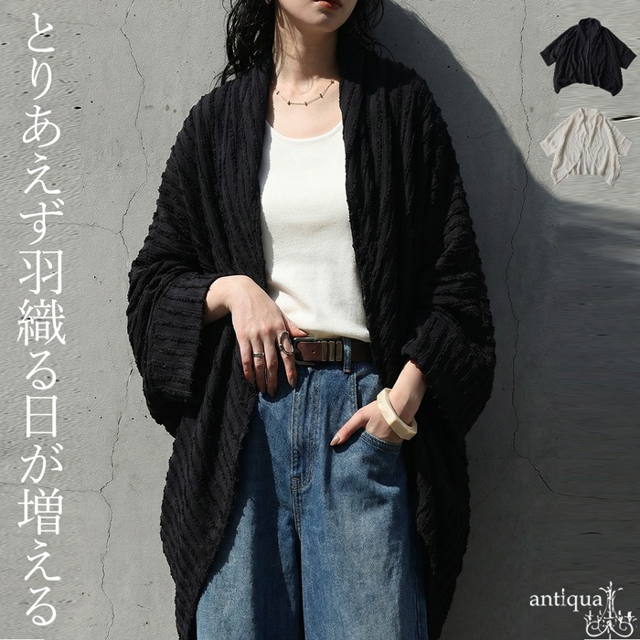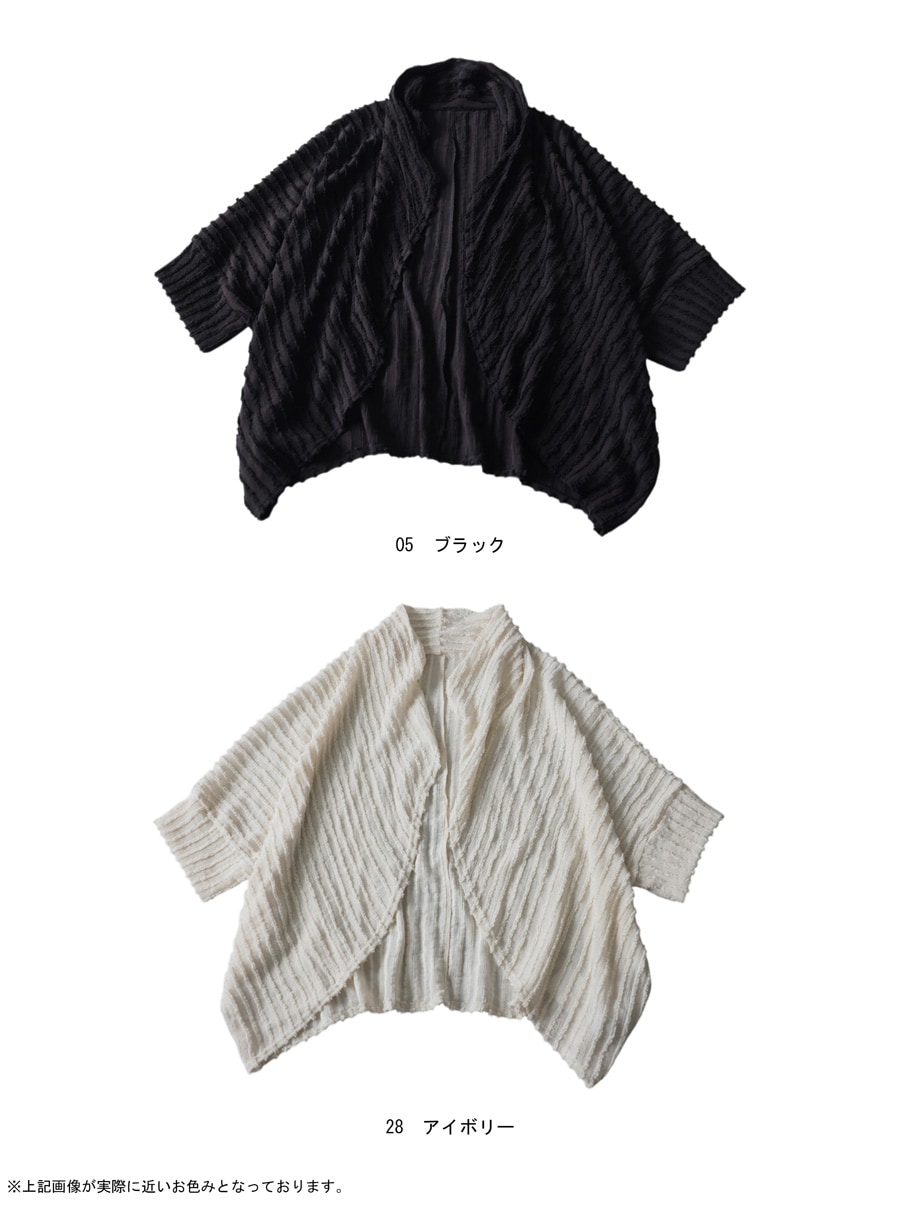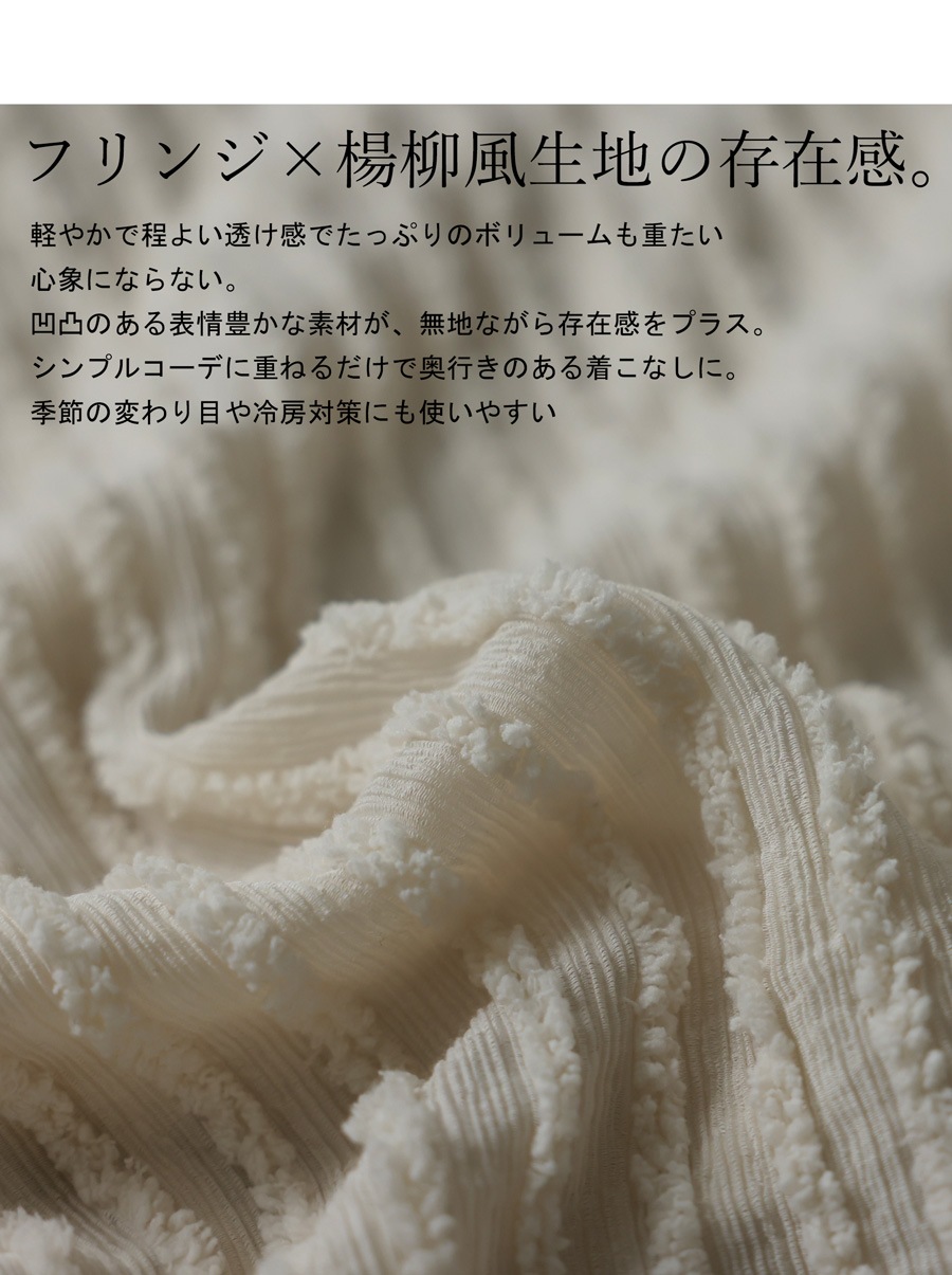 ほんのりシアーな透け感があり、レイヤードや重ね着にも最適で、春夏の軽い羽織りとしてはもちろん冷房対策にも活躍します。
