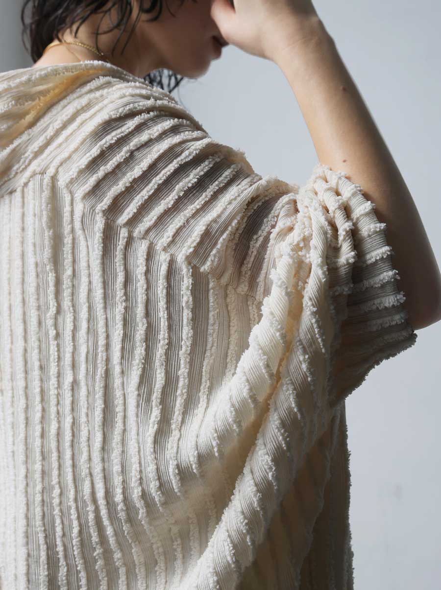前後差のある丈感とルーズなシルエットが動きにニュアンスを生み、横から見ても印象的です。