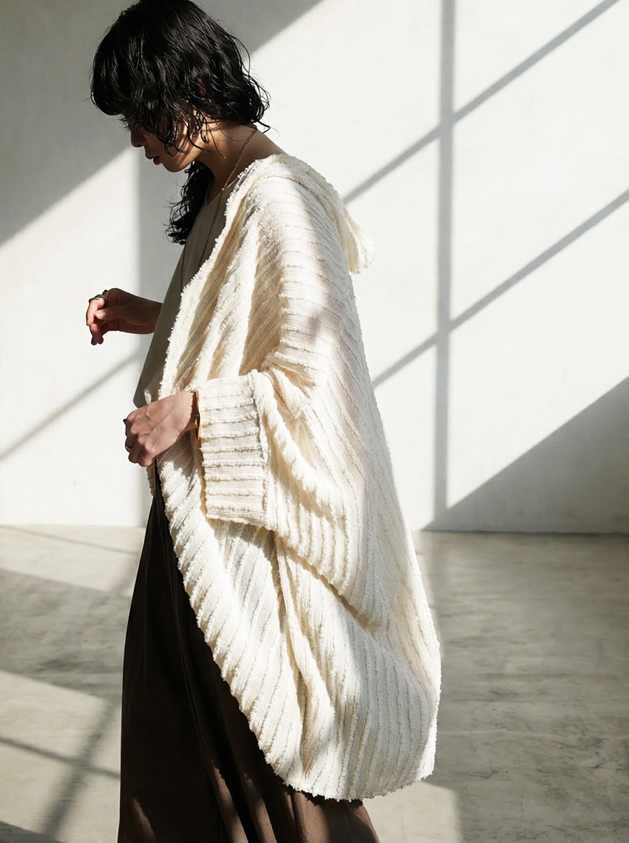 さらりと羽織りやすいショール風のネックラインが顔まわりをすっきり見せ、上品でモードな雰囲気を演出します。