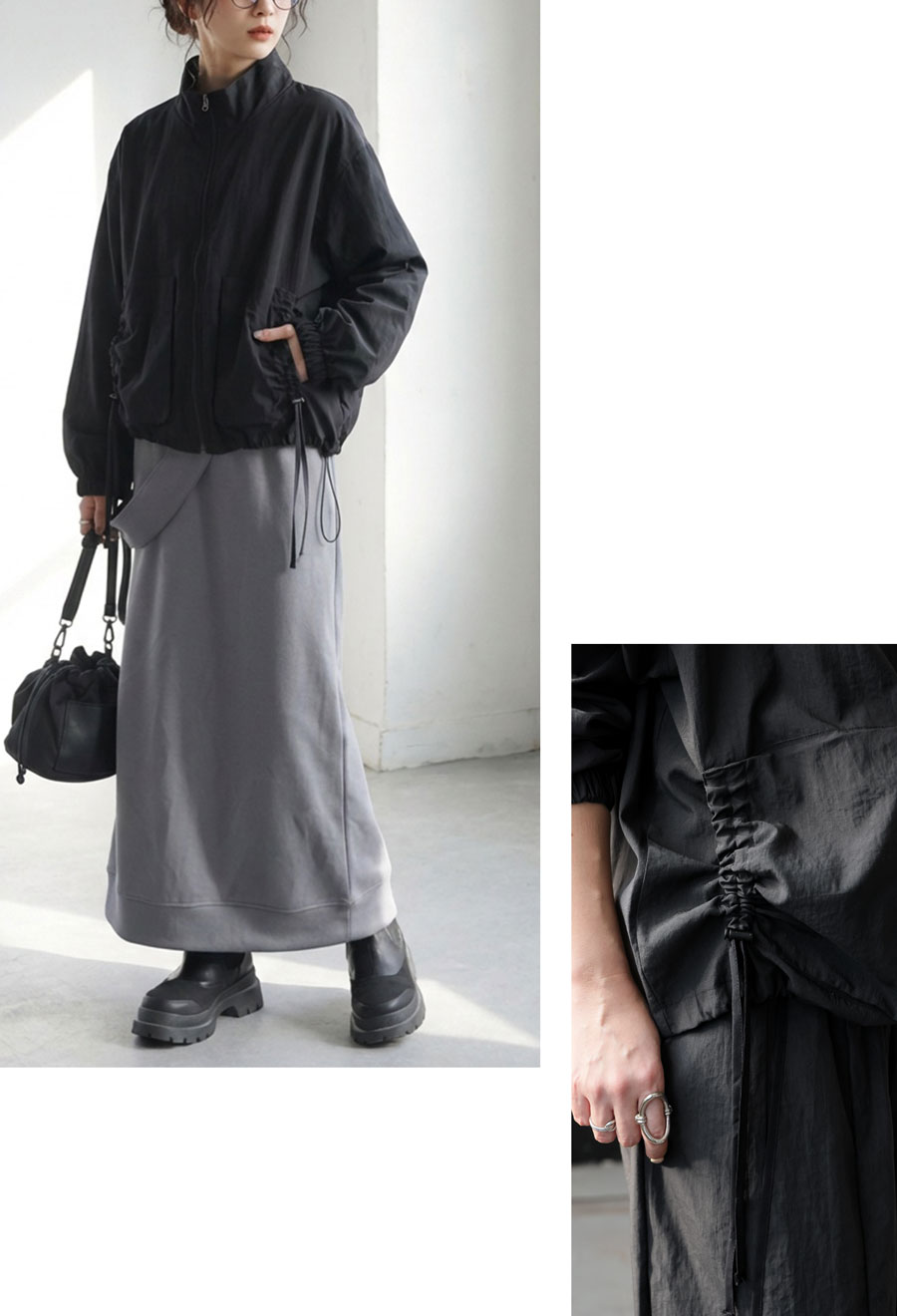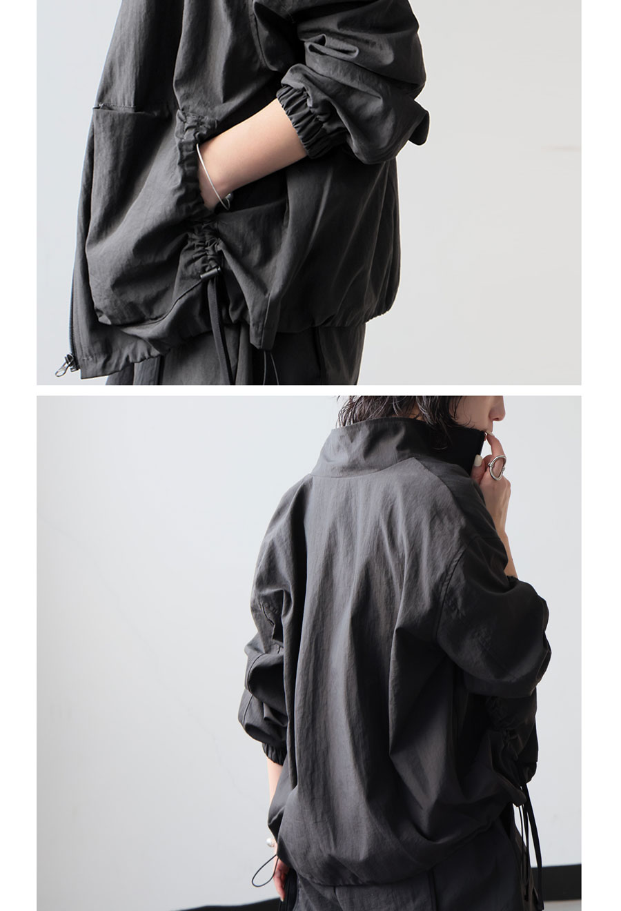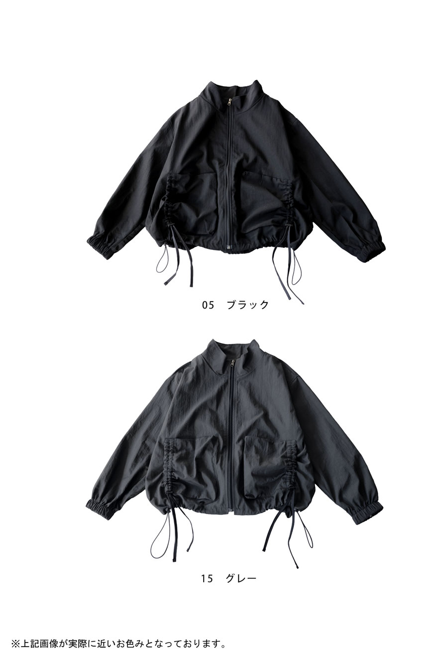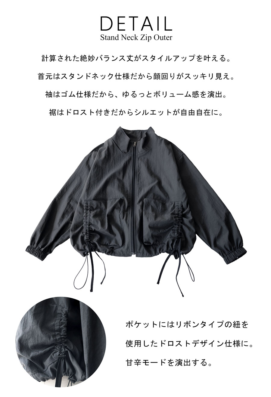 裾にはドローコードを配し、シルエットのアレンジも自在。キュッと絞って丸みのあるフォルムにも変化可能です。