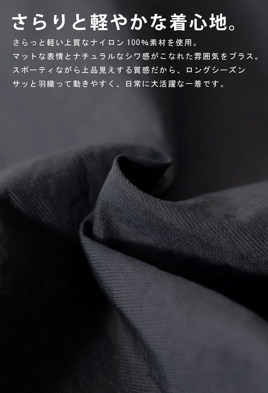 上質なナイロン100%素材を使用し、マットで程よいハリ感がありながら、シャカっと軽くさらっとした着心地を実現。