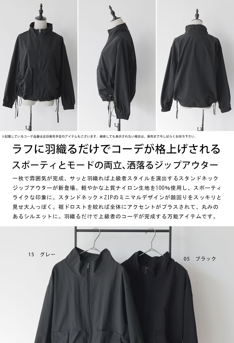 フロントはジップ仕様で開閉しやすく、軽い羽織(アウター)としてロングシーズン活躍します。