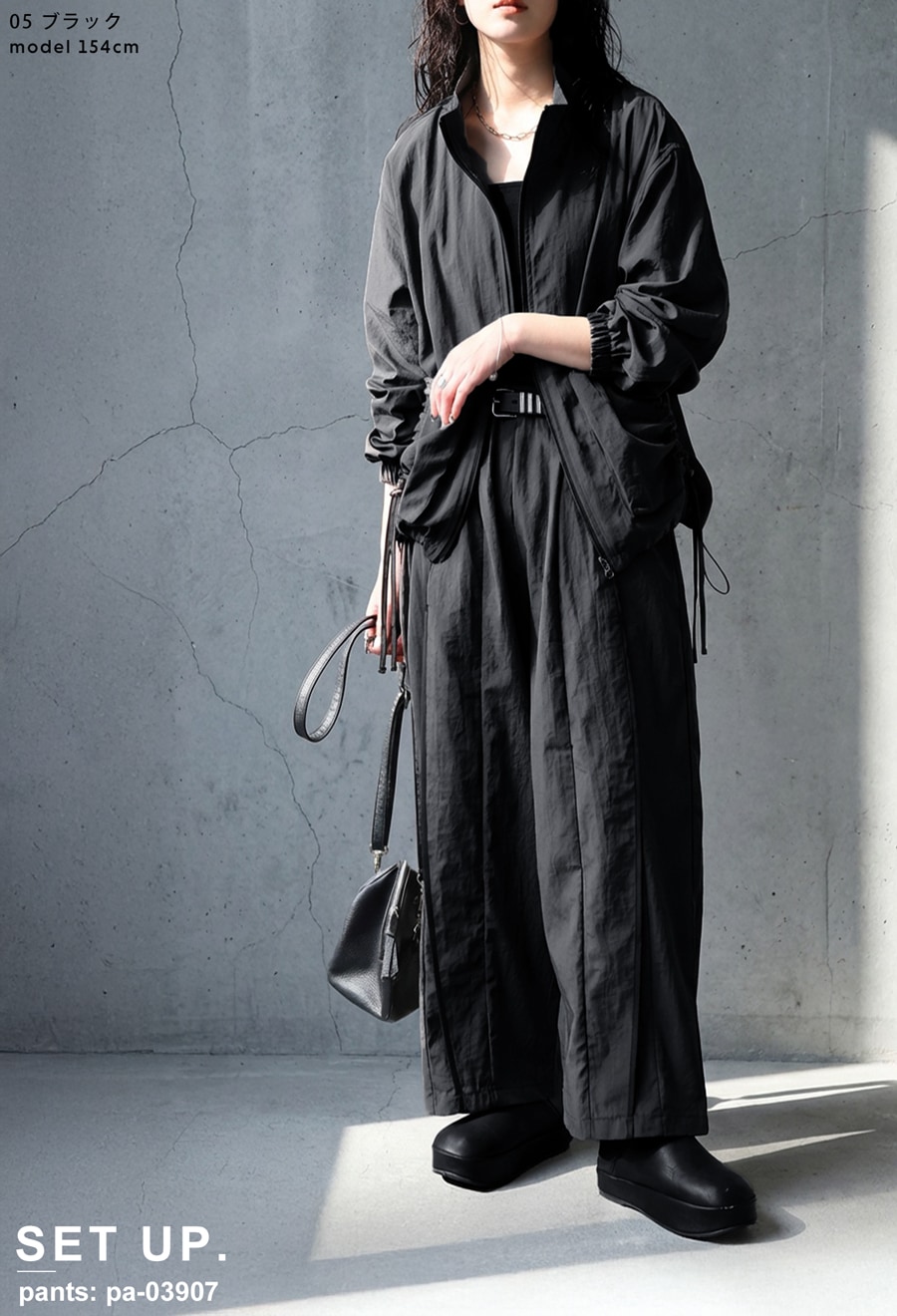 同素材のパンツ(品番:PA-03907)とセットアップでの着用も可能。上下合わせれば統一感のあるスタイルが完成し、街でも映えるコーデに仕上がります。