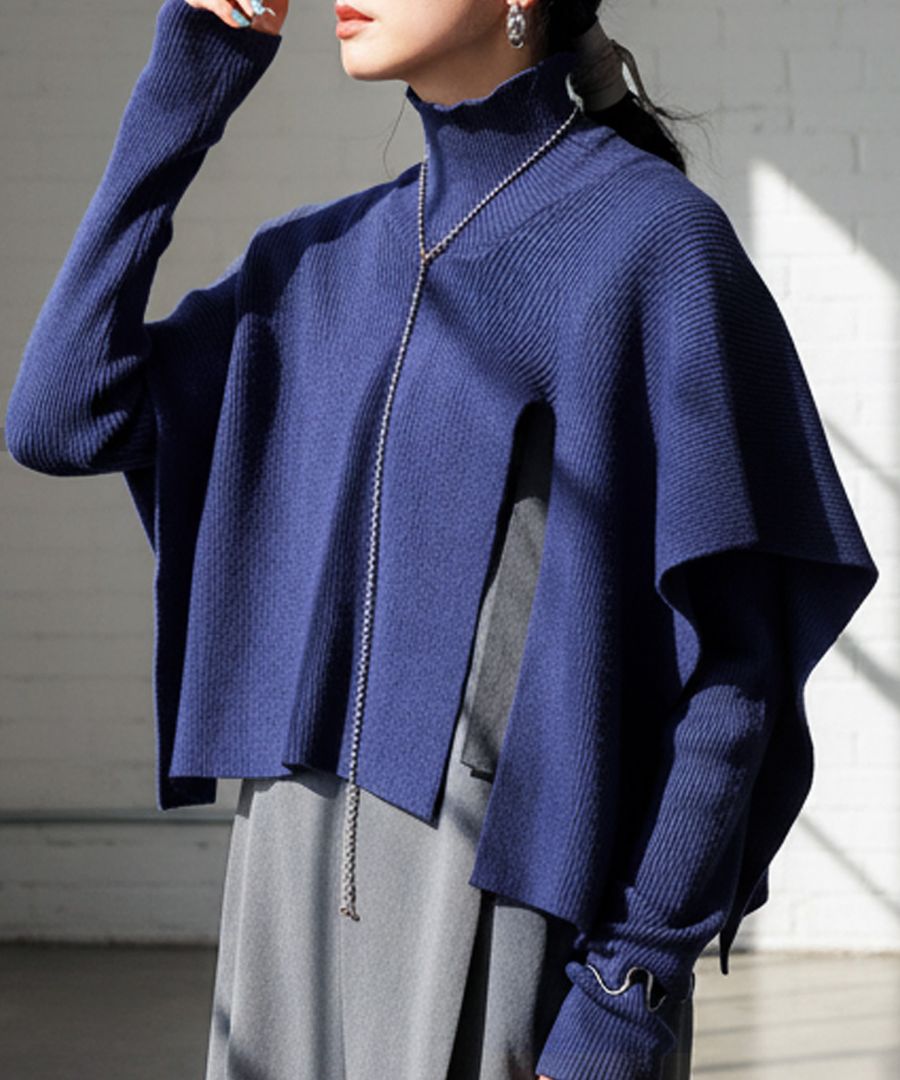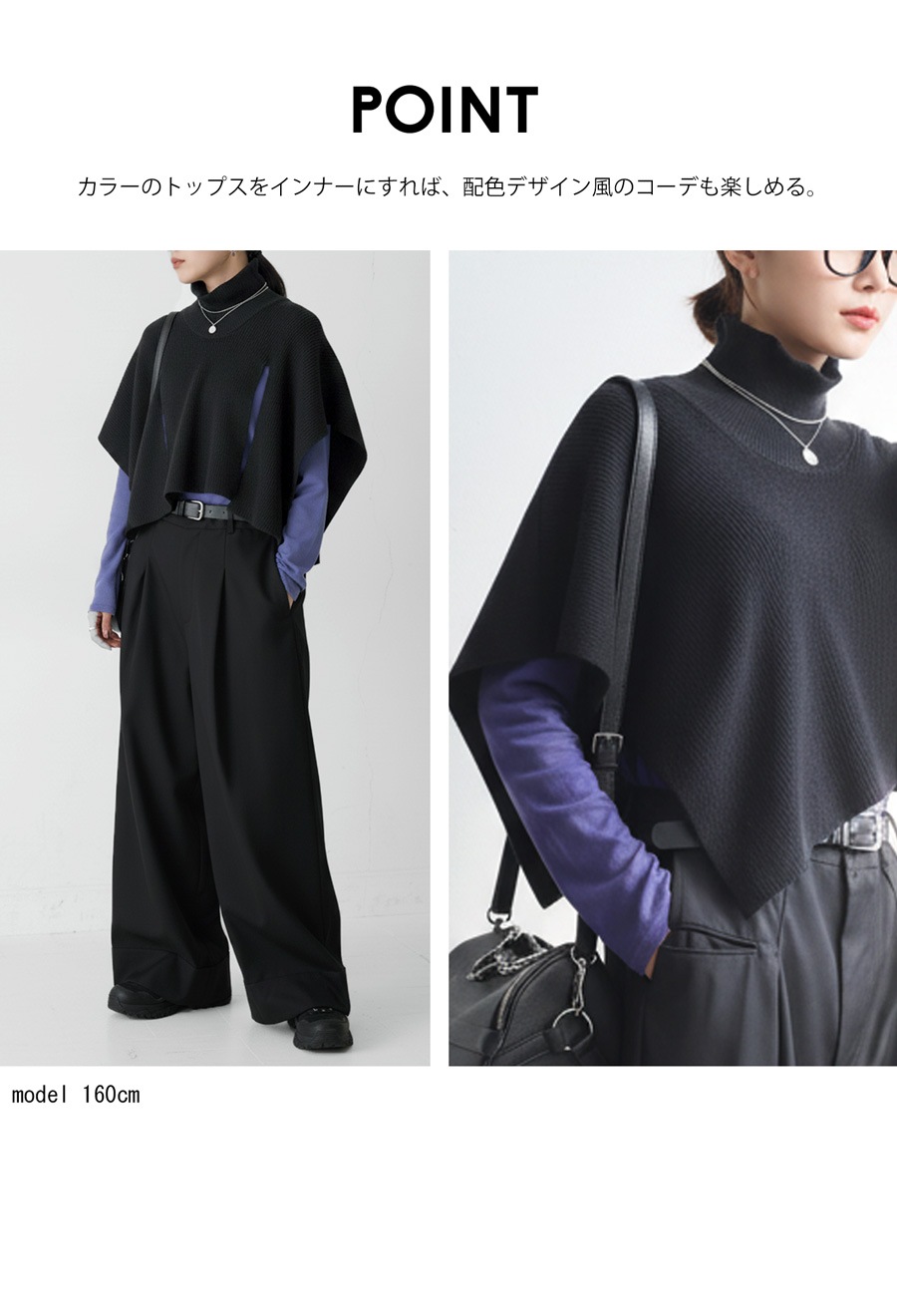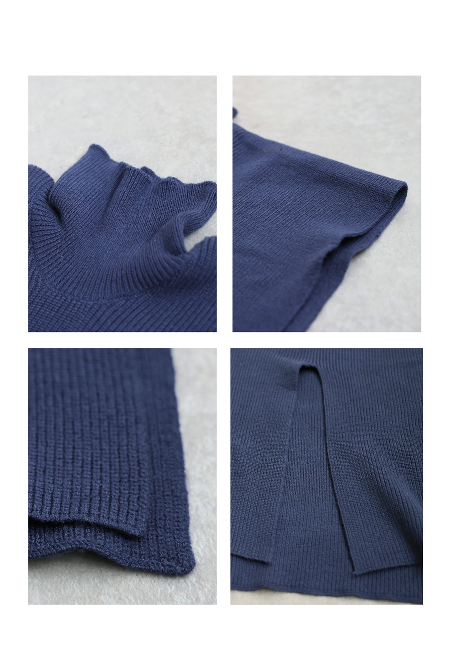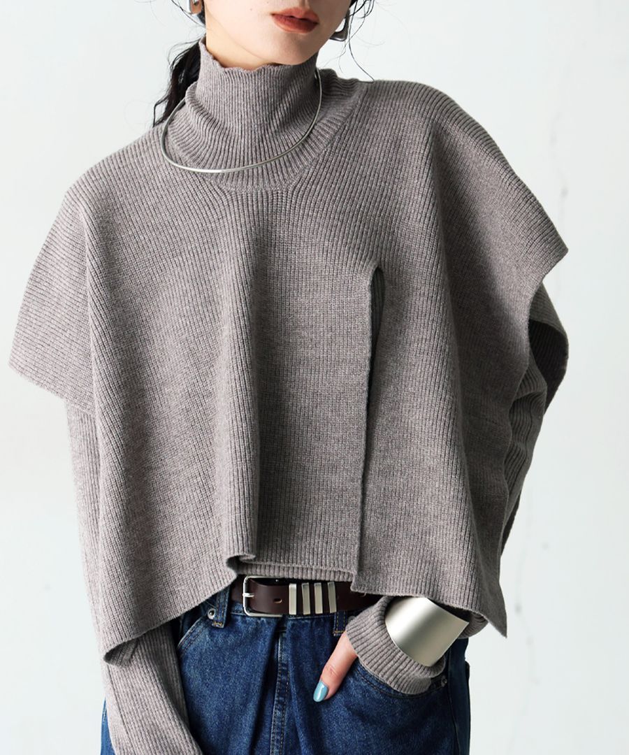 無地のインナーに動きを加えるレイヤード風ベストは、ハイネック(タートルネック)デザインとサイドスリットで立体感と抜け感を演出。