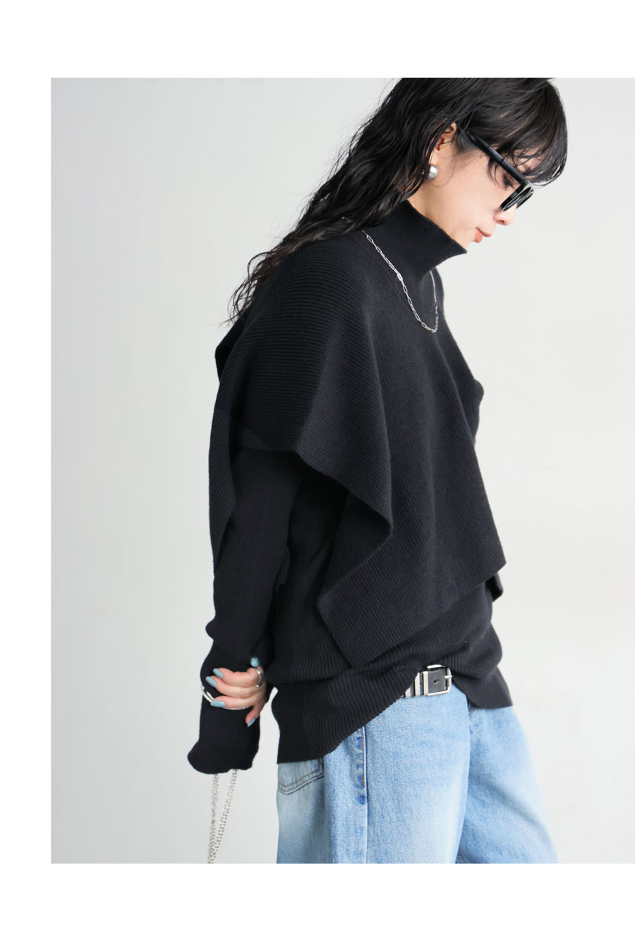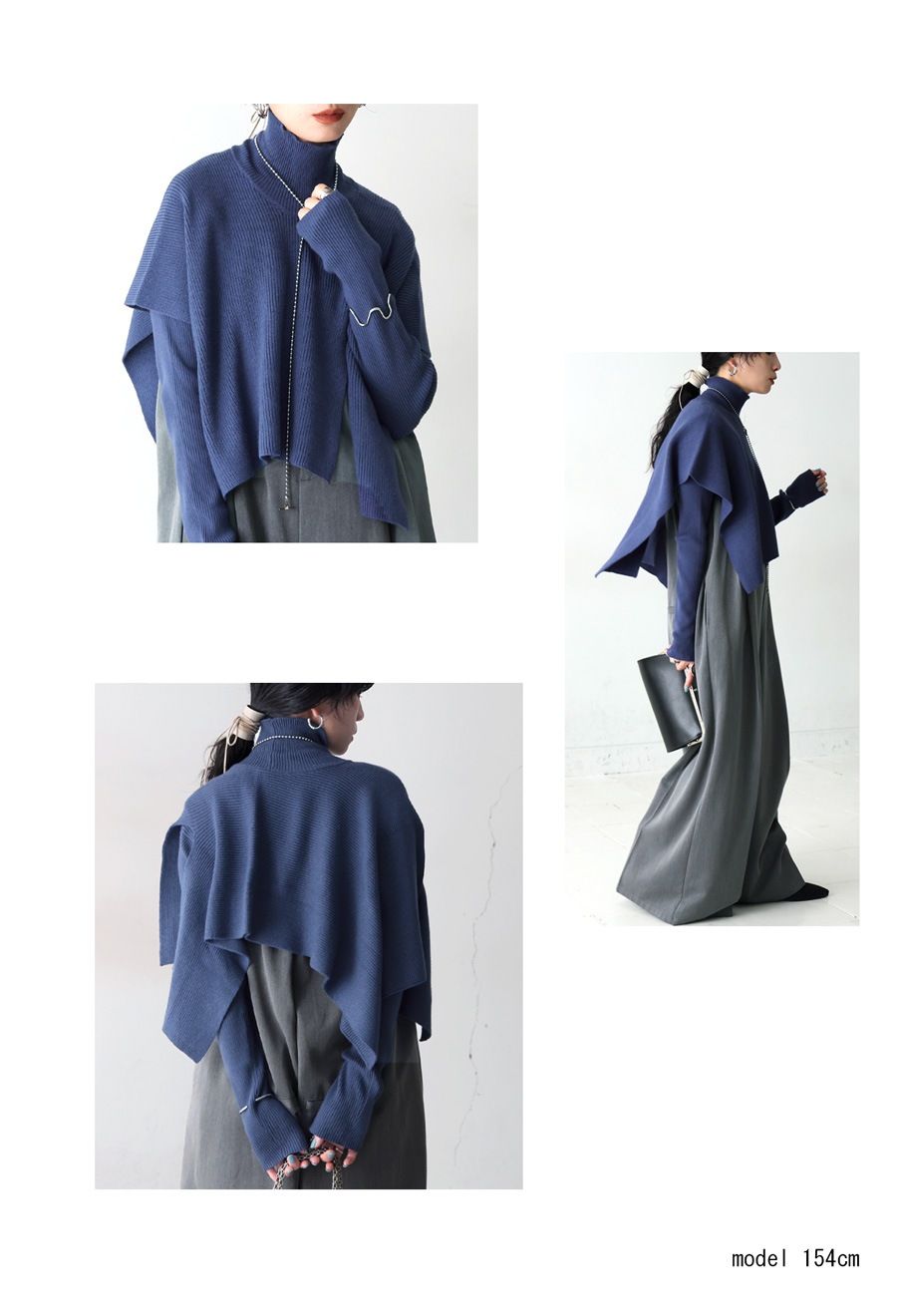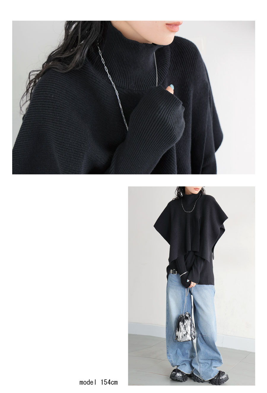無地のインナーに動きを加えるレイヤード風ベストは、ハイネック(タートルネック)デザインとサイドスリットで立体感と抜け感を演出。