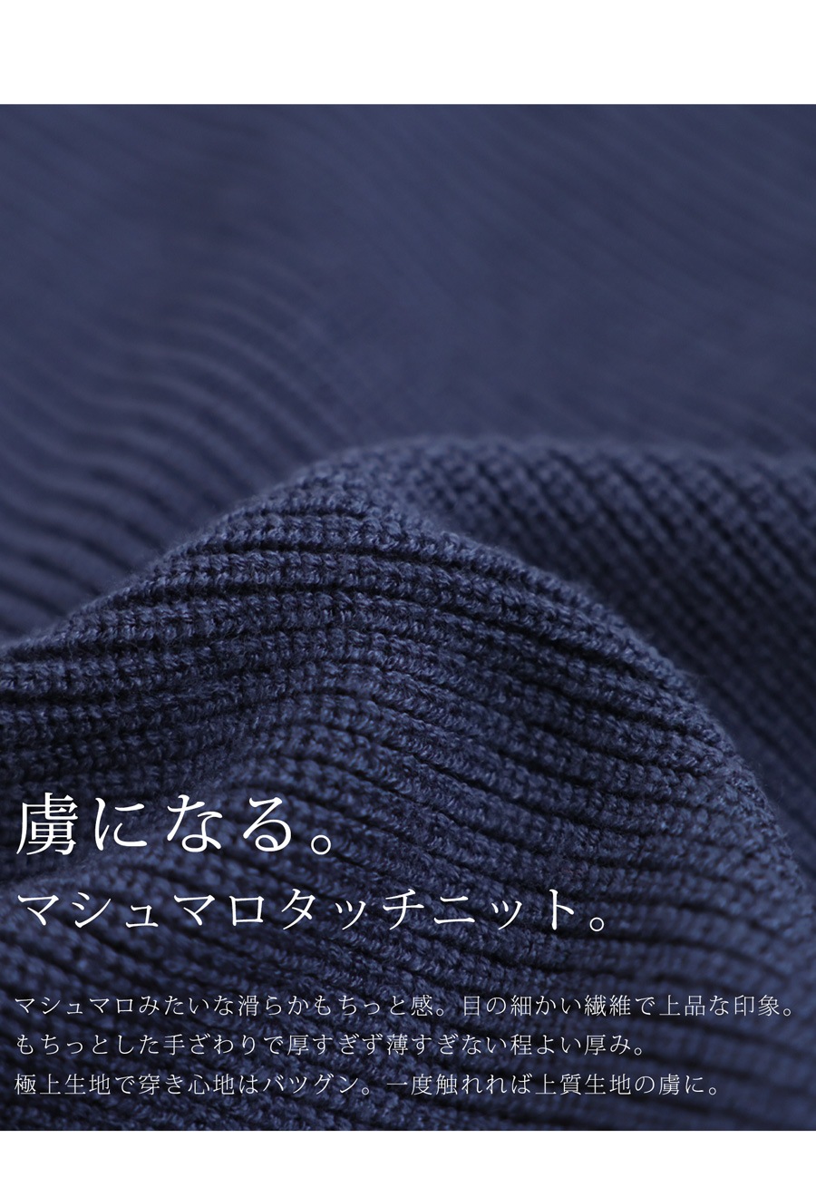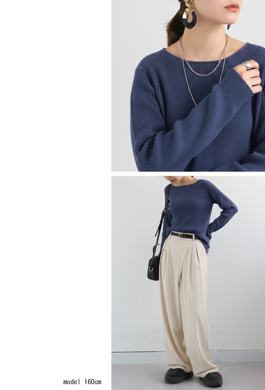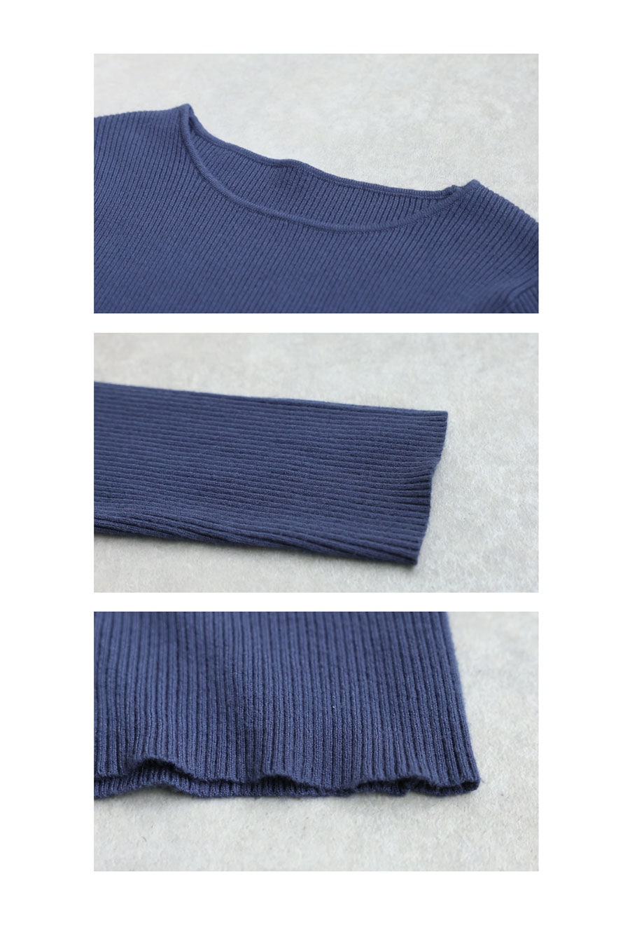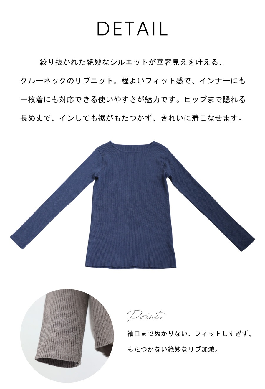 リブニットのネックラインはすっきりとしたクルーネックで、顔周りを明るく見せてくれます。