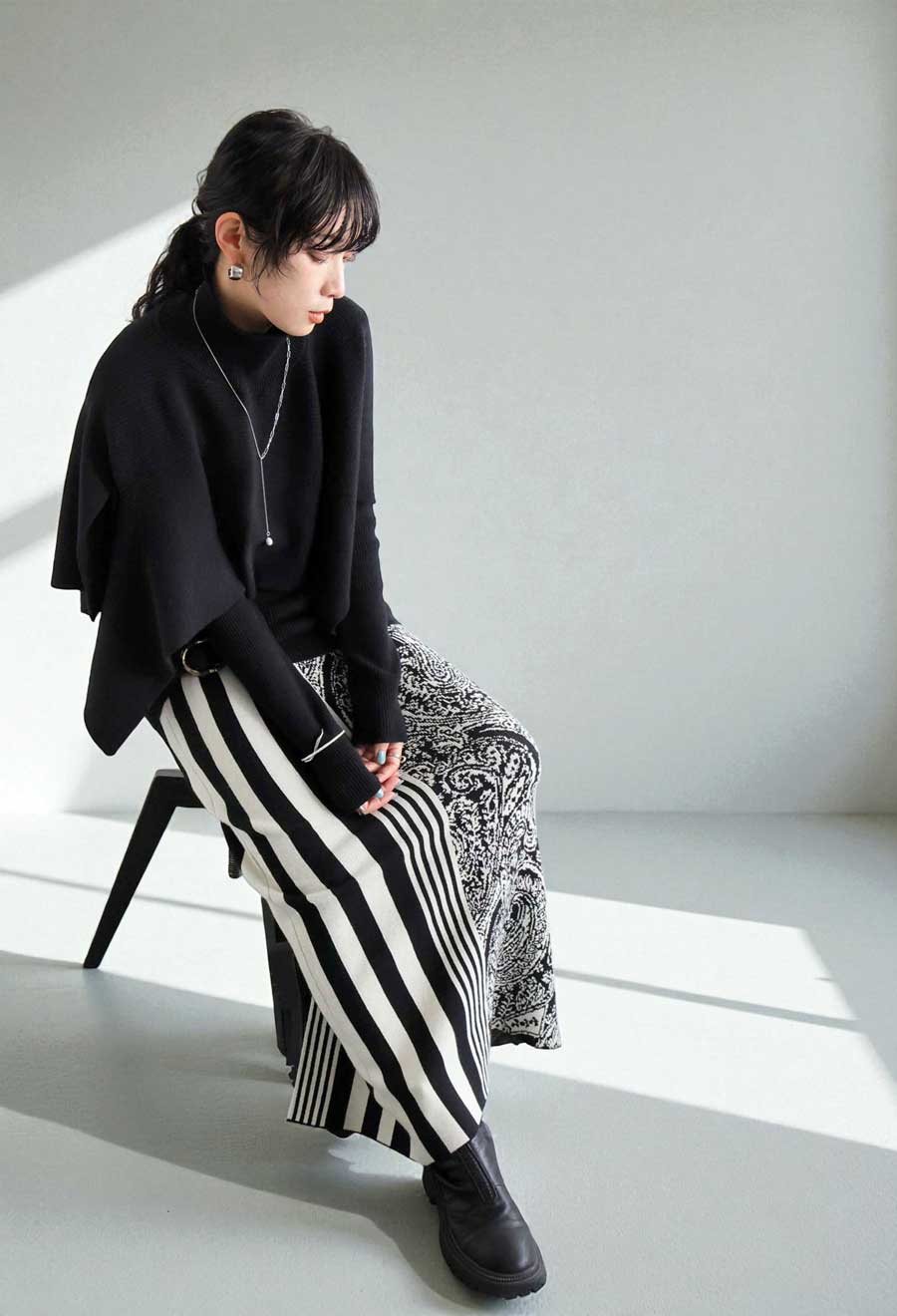 柄のないシンプルな構成ながらも、重ねることで奥行きあるスタイルが完成します。