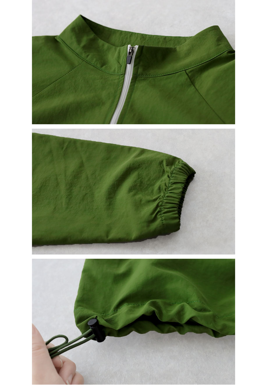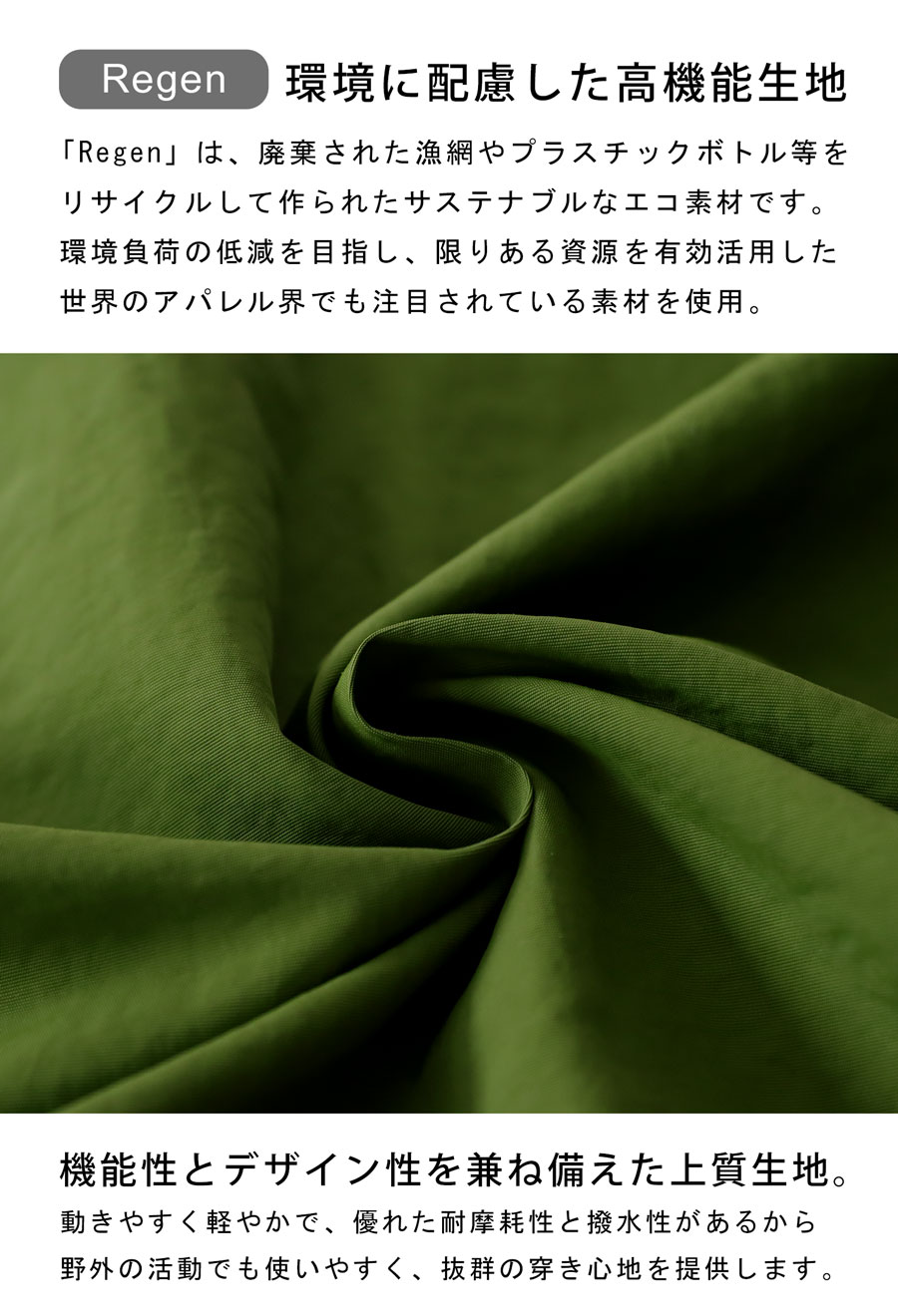 軽量でさらりとした生地は撥水性も備えた多機能素材で、アクティブな動きにも対応します。