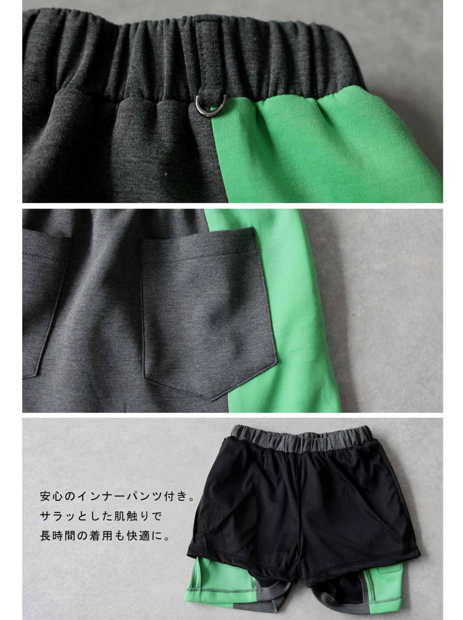 スカート見えするデザインながら、内側にハーフパンツ仕様のインナーパンツ付き(インナーパンツ付き・裏地付き)で安心して動けるミニスカートタイプのキュロット(キュロットスカート)です。