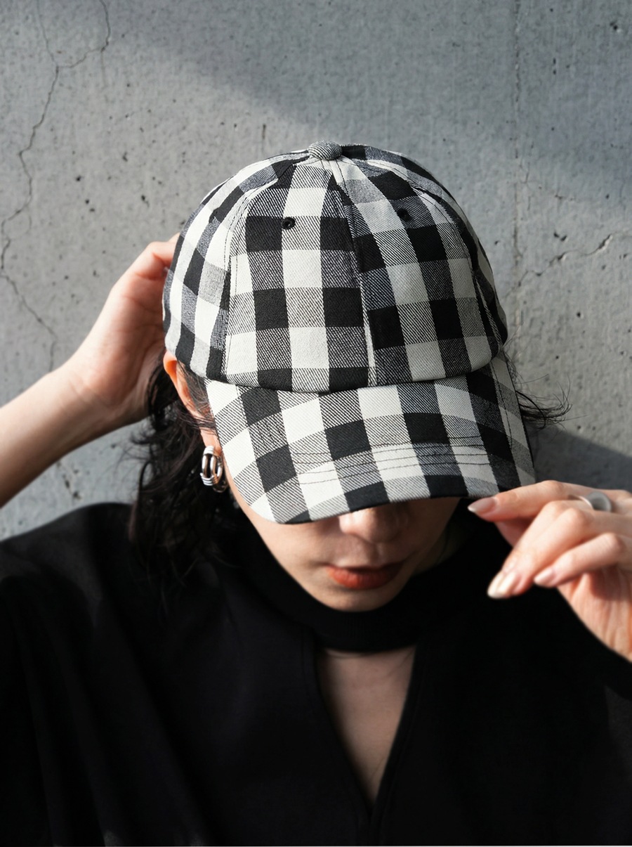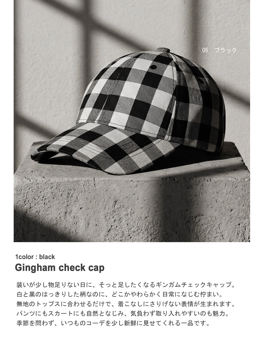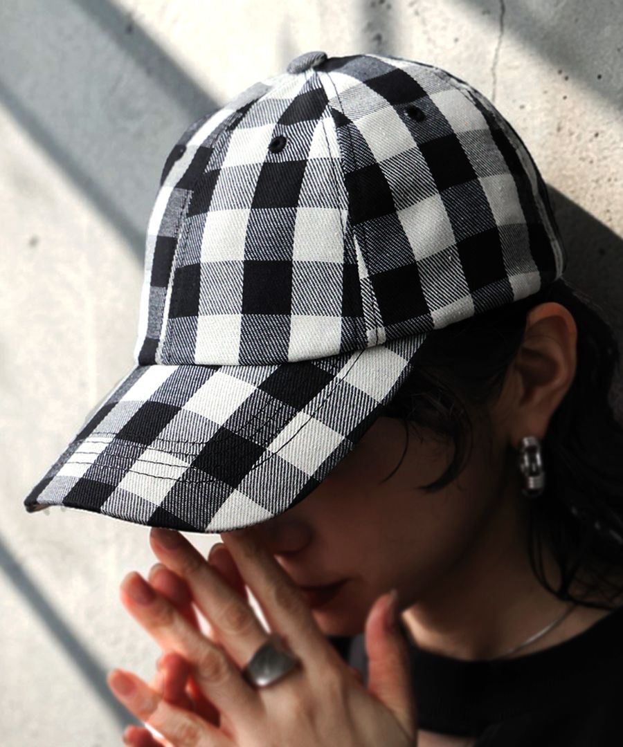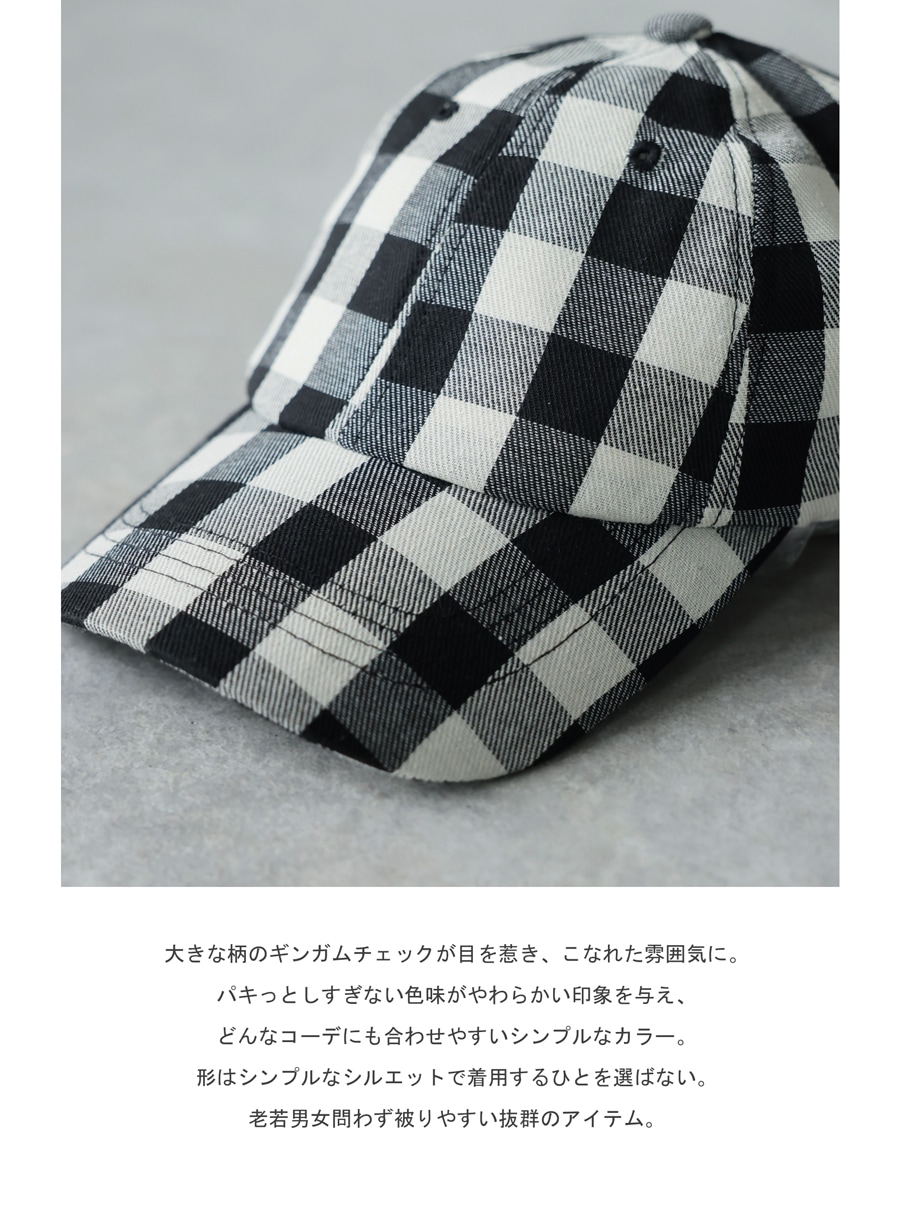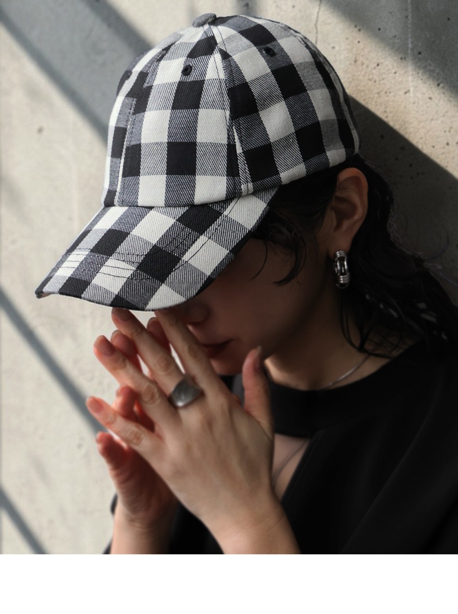 大きめのギンガムチェック柄が印象的なキャップは、コーデにさりげないアクセントを加える帽子です。
